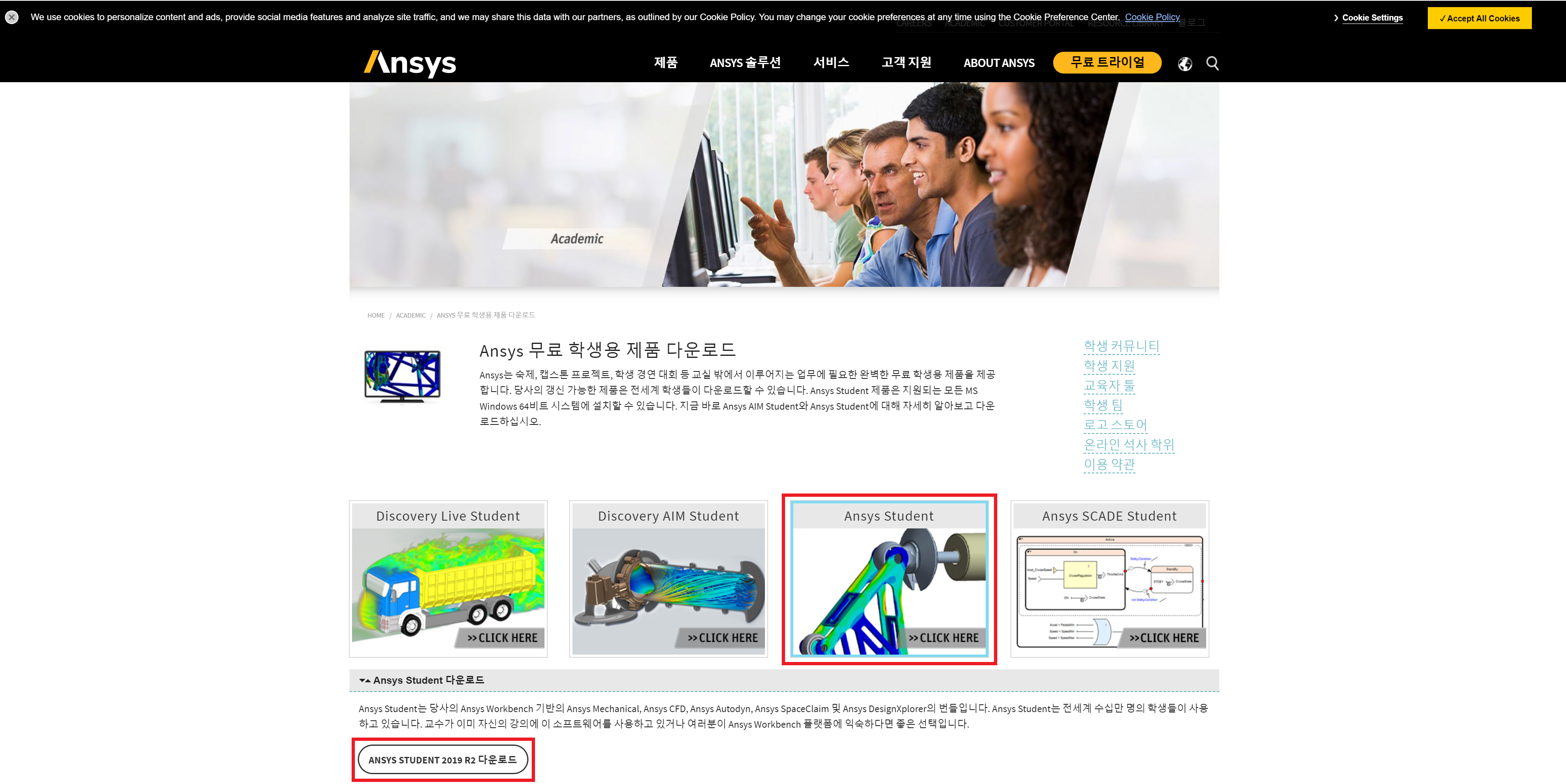 ANSYS 무료 학생용 제품 다운로드 페이지에서 'Ansys Student - ANSYS STUDENT 2019 R2 다운로드'를 클릭하면 이용약관을 확인하는 창이 나타나고 'AGREE & DOWNLOAD'를 클릭하면 설치파일 다운로드가 시작된다.