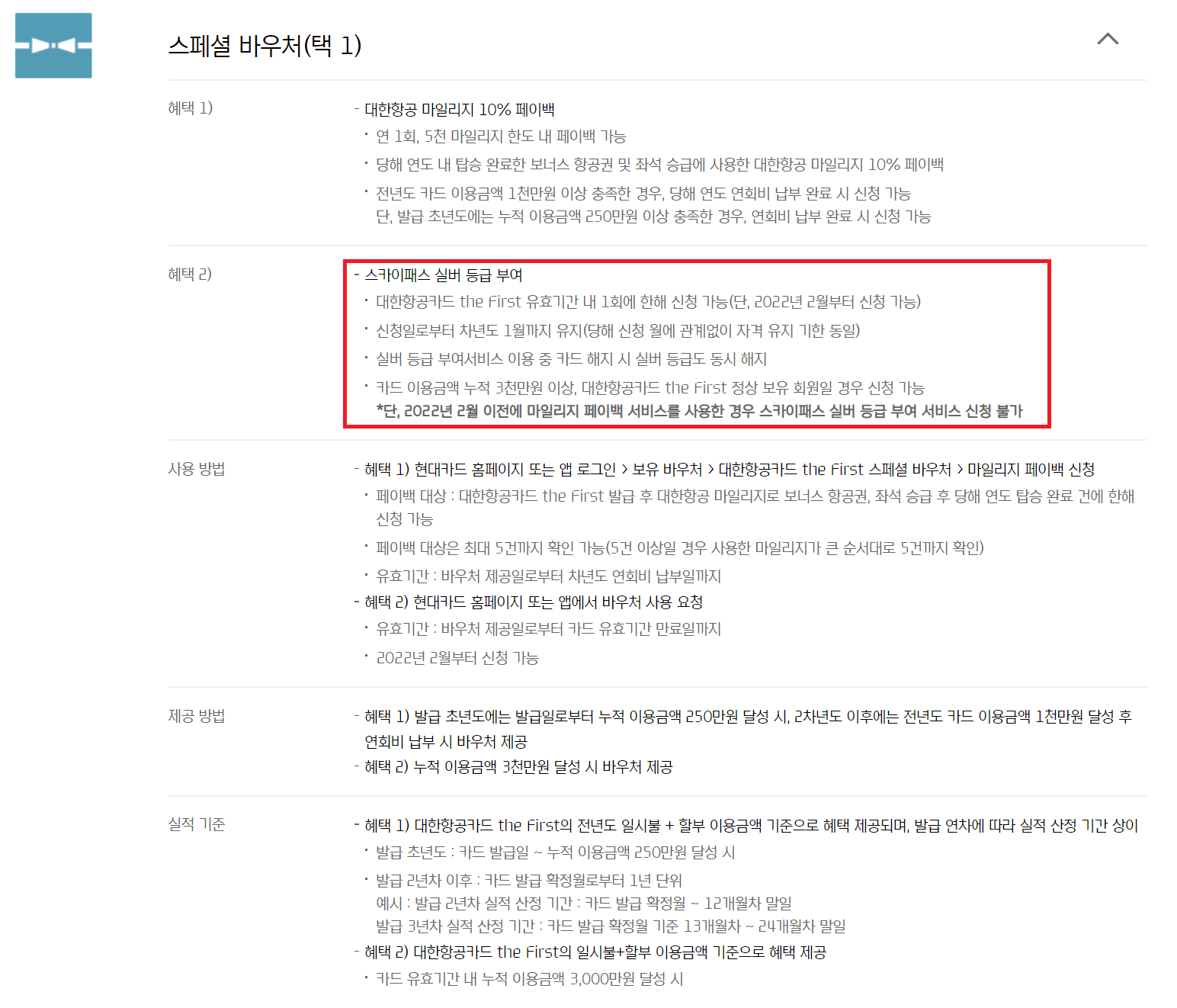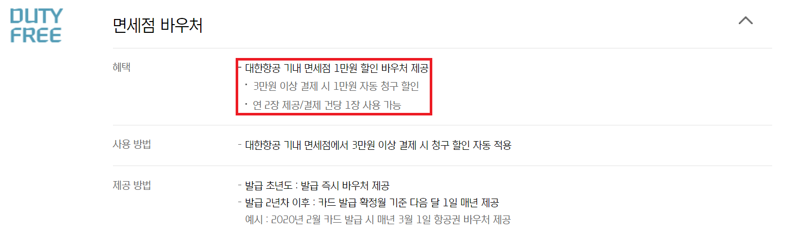 그리고 마일리지 적립이나 공항 라운지 이용, 발레파킹, 커피전문점 할인 등 당연히 있어야 할 혜택 말고 대한항공 the first의 바우처 혜택을 보면, 발급 초년도에 250만 원을 결제할 경우, 발급 2년 차 때 3,000만 원을 결제한 만큼의 혜택을 받을 수 있다.