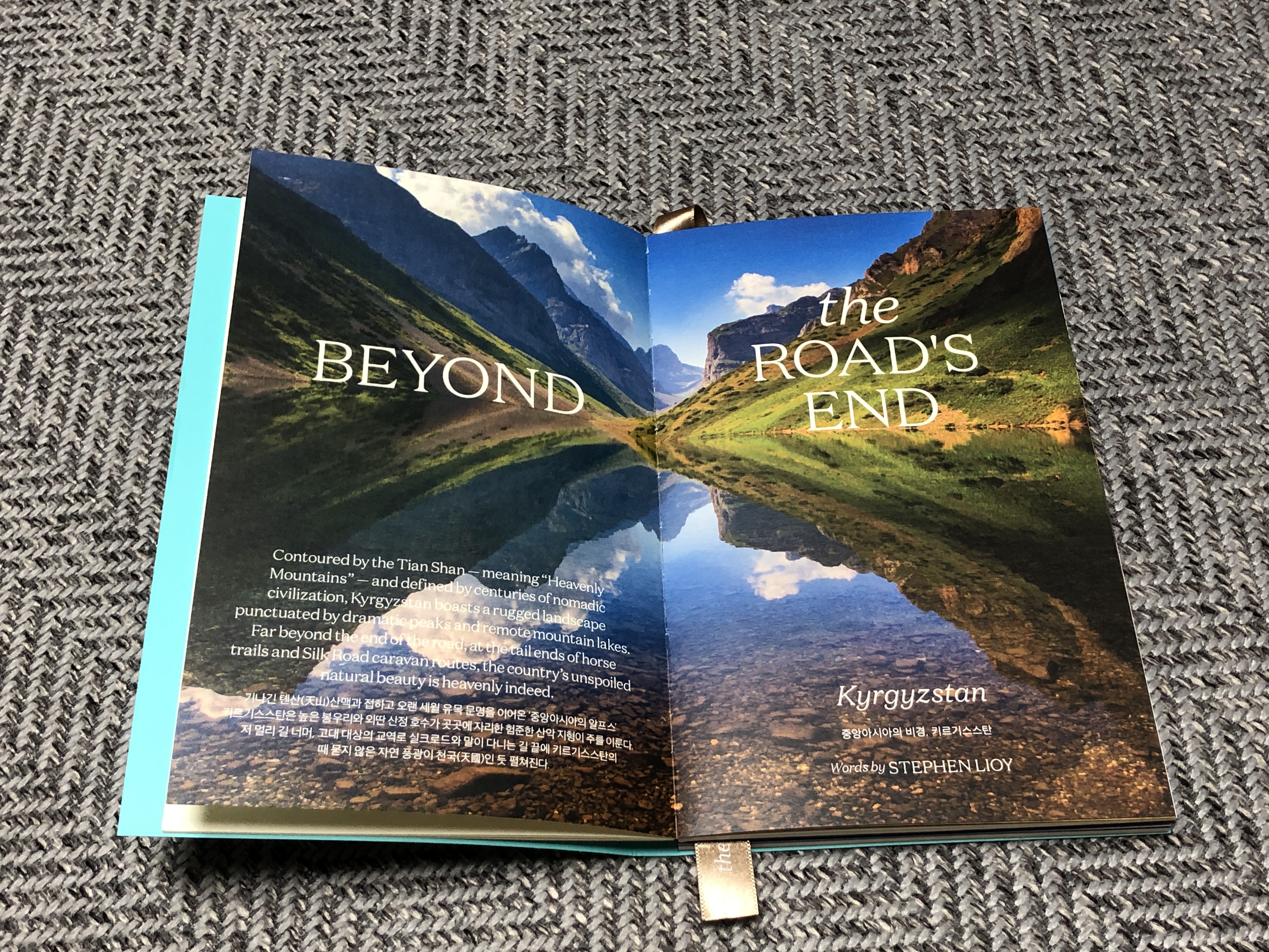 다음으로 민트색 패키지를 열어보면 아주 두꺼운 종이로 제본된 책자다. 한 장씩 넘겨보면 세계 각지의 여행지 사진과 정보들이 담겨있고 대한항공의 취항지와 항공기 기종, KAL라운지 정보, 현대카드 라이브러리 정보 등이 담겨있는데, 담겨있는 내용에 비하면 제본 상태는 너무 엉망이다.