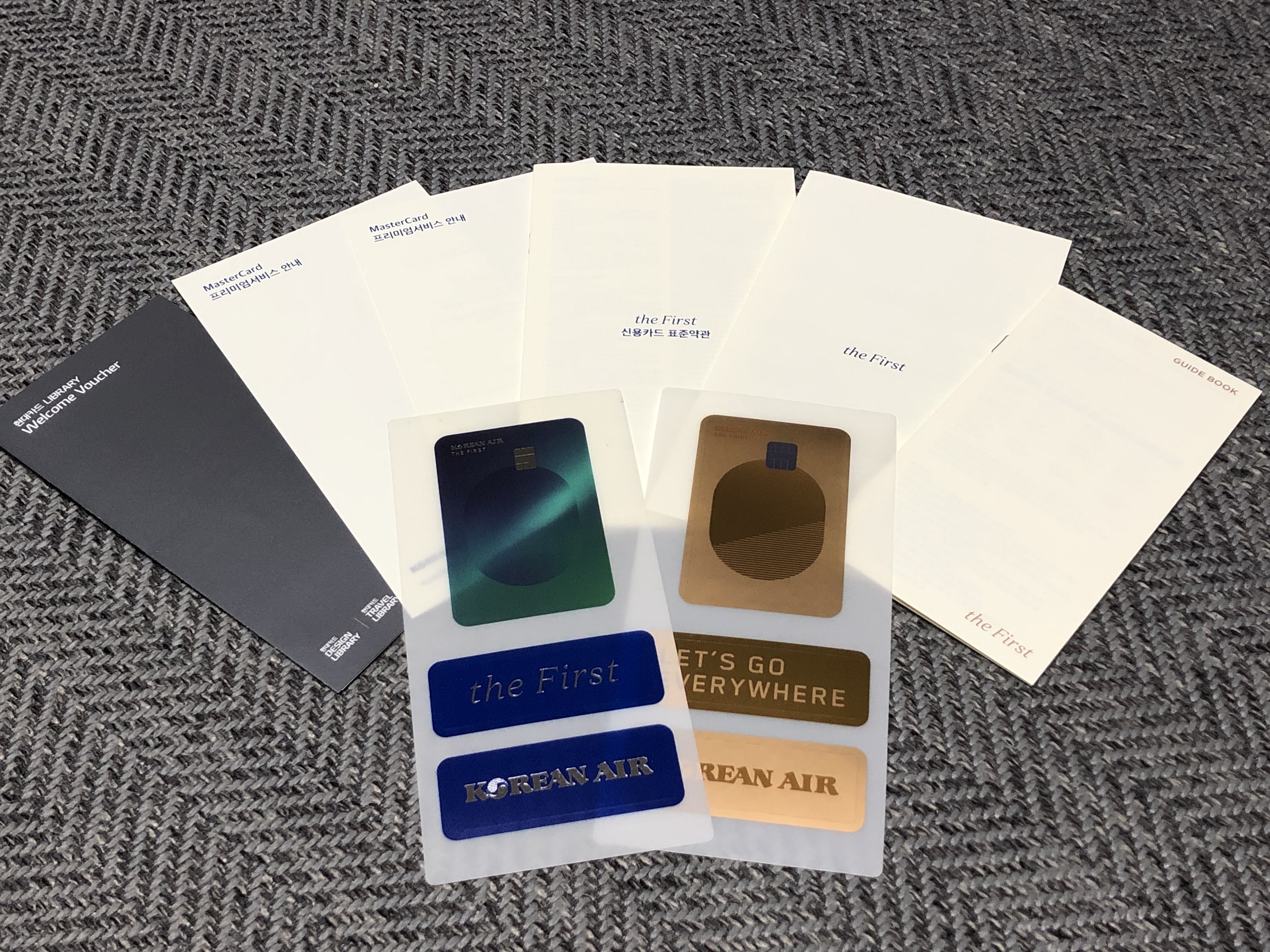 먼저 왼쪽의 흰색 패키지를 열어보면 약관, 가이드북, 바우처 등 각종 안내 책자와 스티커가 들어있는데, 스티커는 정말 이걸 어디에 써야 할지 난감하다. 다른 등급의 카드에 들어있는 스티커는 캐리어나 노트북 등에 데코로 붙이거나 스티커 자체로도 이쁜데, the first에 들어있는 스티커는 고급진 것도 아니고 캐주얼도 아니고 좀 그렇다.