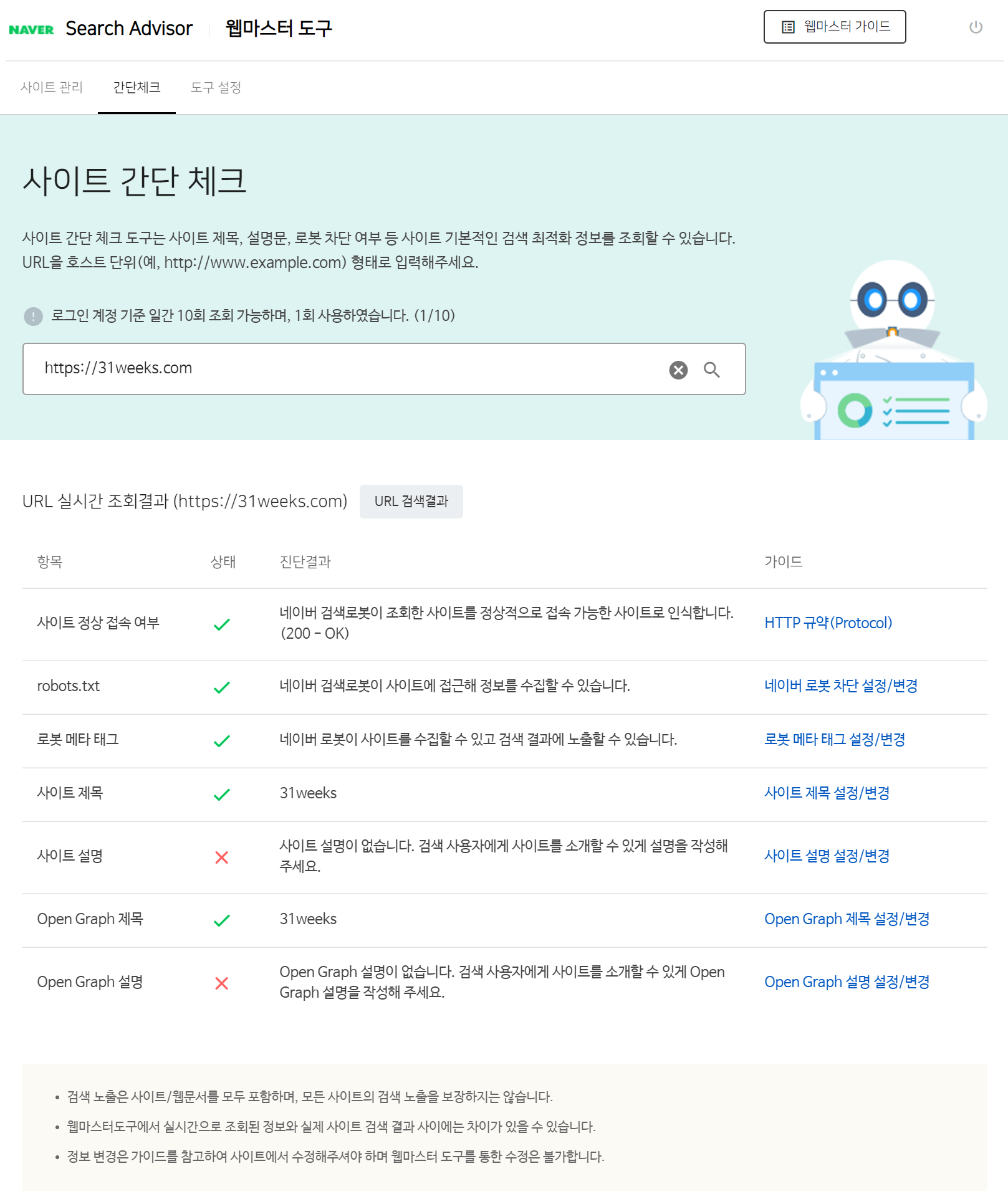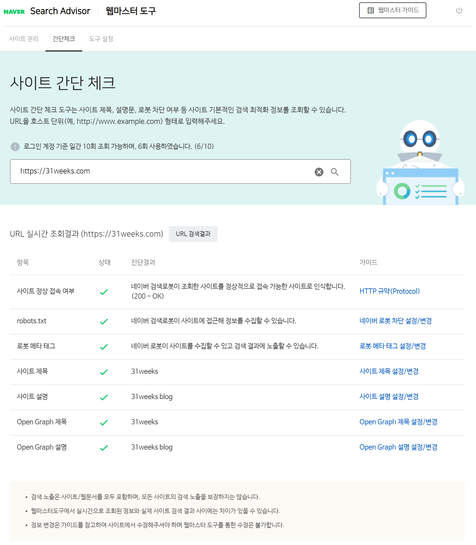사이트 등록 완료 후, '웹마스터 도구 - 간단체크'에서 등록된 블로그 주소(https://31weeks.com)를 입력하고 엔터키를 누르면 등록된 사이트에 대한 진단 결과가 나온다.