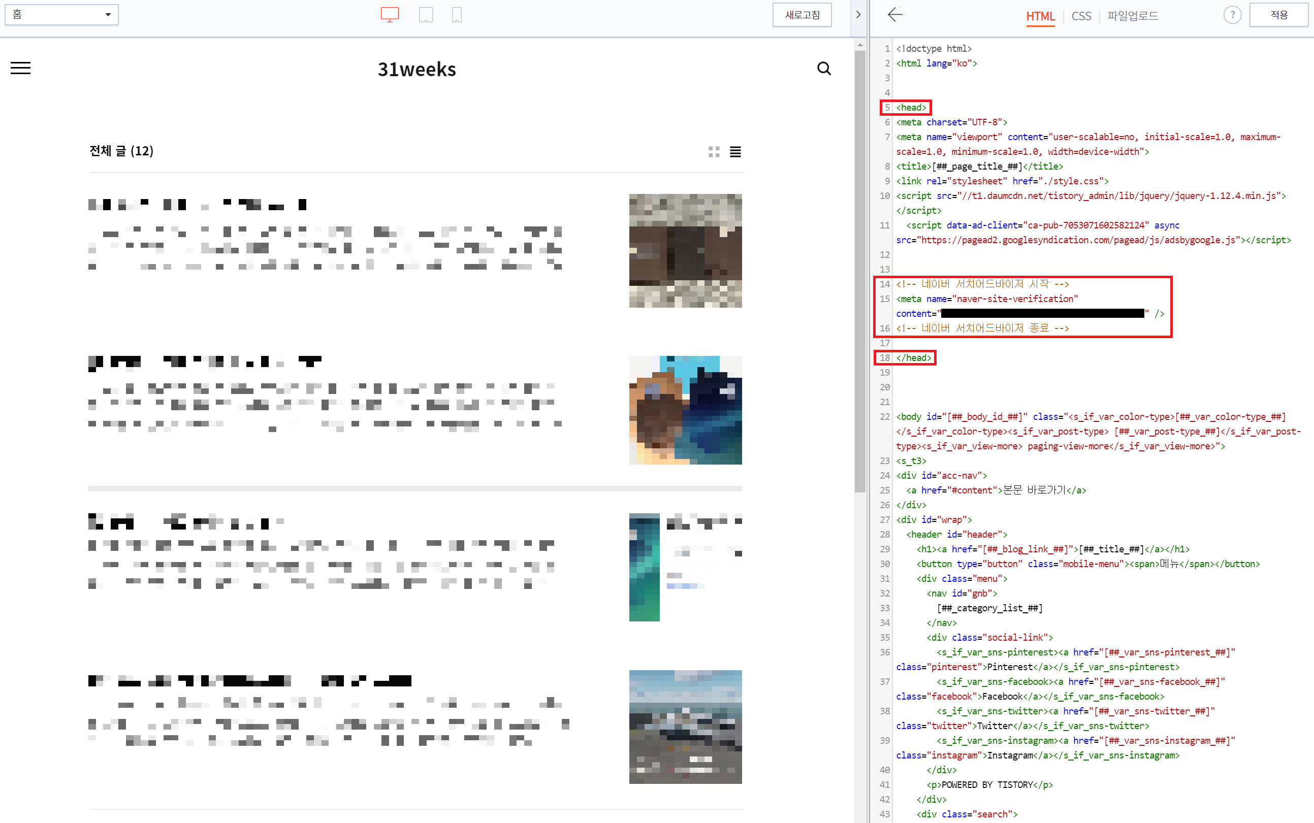 우측에 html 편집 화면이 나오면, 네이버 서치어드바이저에서 복사한 메타 태그를 <head>와 </head> 태그 사이에 붙여 넣는다.