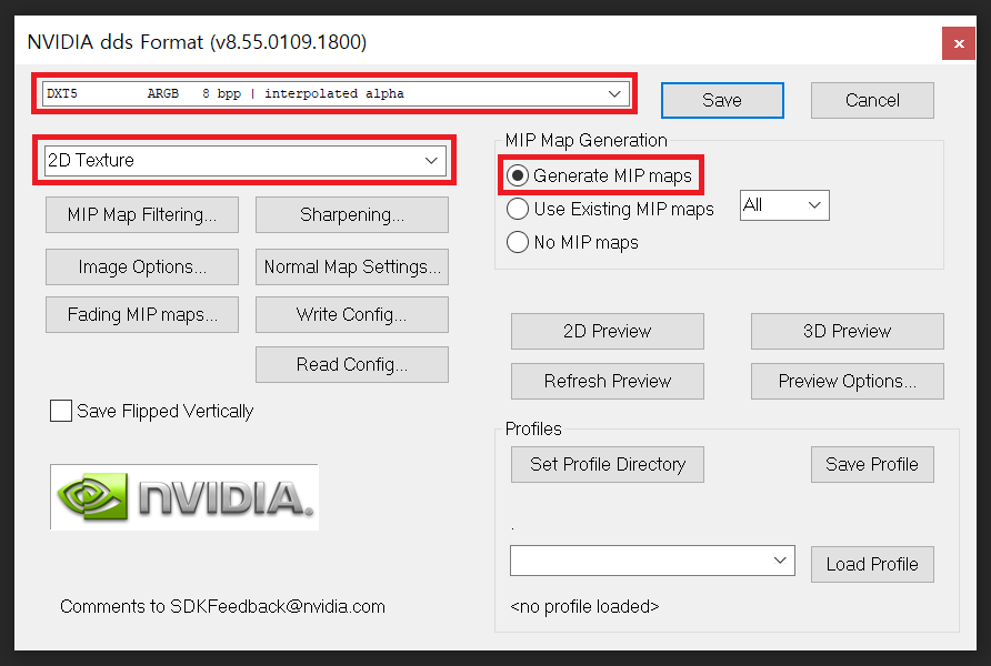 스킨 편집이 완료하면, 저장할 때 아래와 같이 'DXT5 ARGB 8 bpp | interpolated alpha', '2D Texture', 'Generate MIP maps'로 설정되어있는지 확인하고 저장한다.