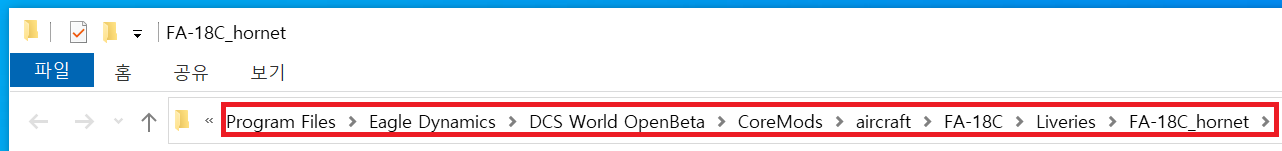 플러그인 완료되었으면, 수정할 스킨을 구해야 하는데 F/A-18C Hornet의 스킨을 기준으로 진행하도록 하겠다. 스킨이 있는 폴더의 위치는 'C:\Program Files\Eagle Dynamics\DCS World OpenBeta\CoreMods\aircraft\FA-18C\Liveries\FA-18C_hornet'인데, 폴더 이름이 다를 경우에는 'C:\Program Files' 또는 'C:\'에서 'VFA-34', 'VFA-37' 등 F/A-18C의 Skin 이름으로 검색하면 폴더 위치를 찾을 수 있다.