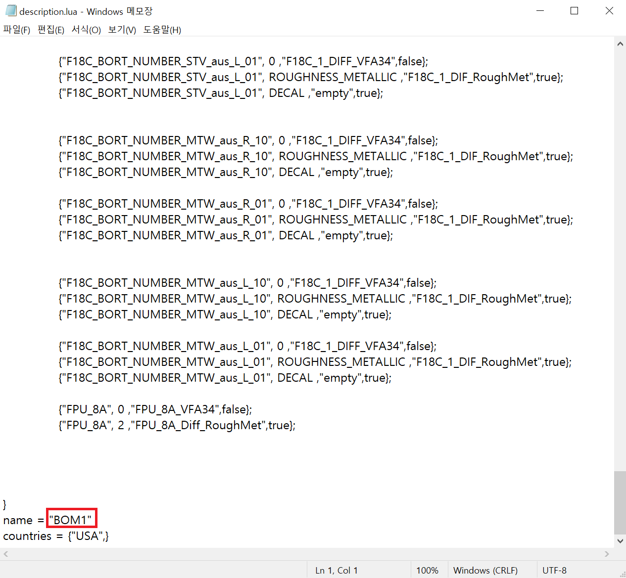 스킨이 있는 폴더( 'VFA-34', 'VFA-37' 등)를 찾았으면, 일단 바탕화면이나 찾기 쉬운 곳으로 복사한 뒤, 폴더 이름을 자신이 원하는 스킨 이름으로 바꾸고, 폴더 안에 있는 'description.lua' 파일을 메모장으로 열어서 제일 마지막 부분에 'name' 항목을 폴더 이름과 동일한 이름으로 수정하고 저장한다.