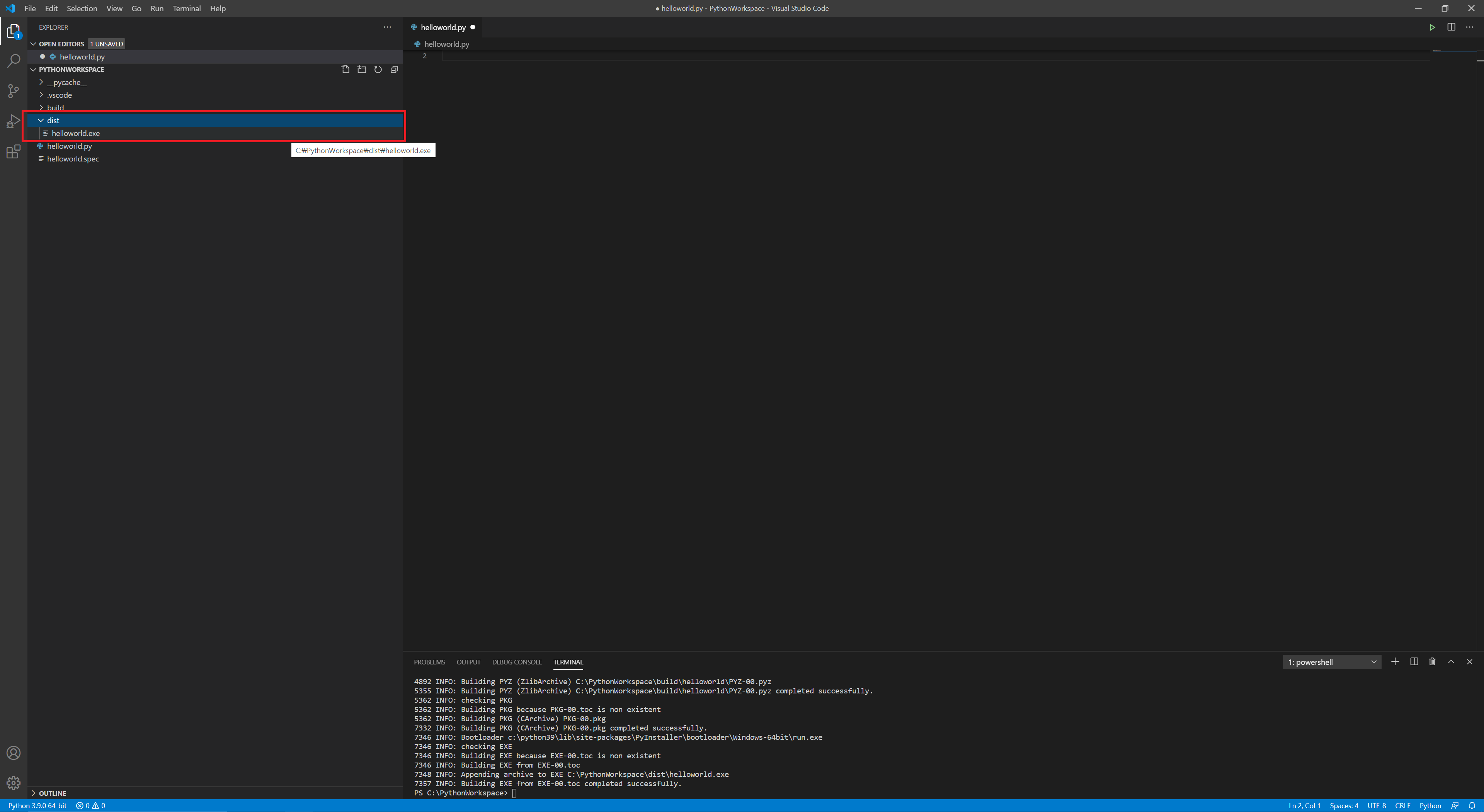'pyinstaller' 설치가 완료되면 pyinstaller .\helloworld.py를 입력해서 exe파일을 생성한다.