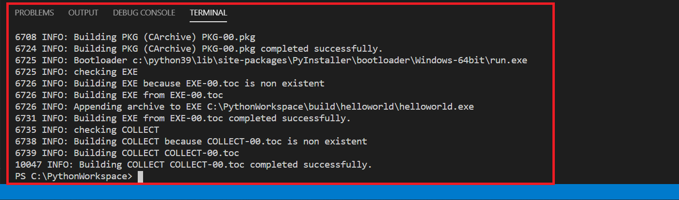 (이때, 'pyinstaller hello'까지 입력하고 키보드의 'Tab'키를 누르면 자동으로 'pyinstaller .\helloworld.py'가 입력된다)