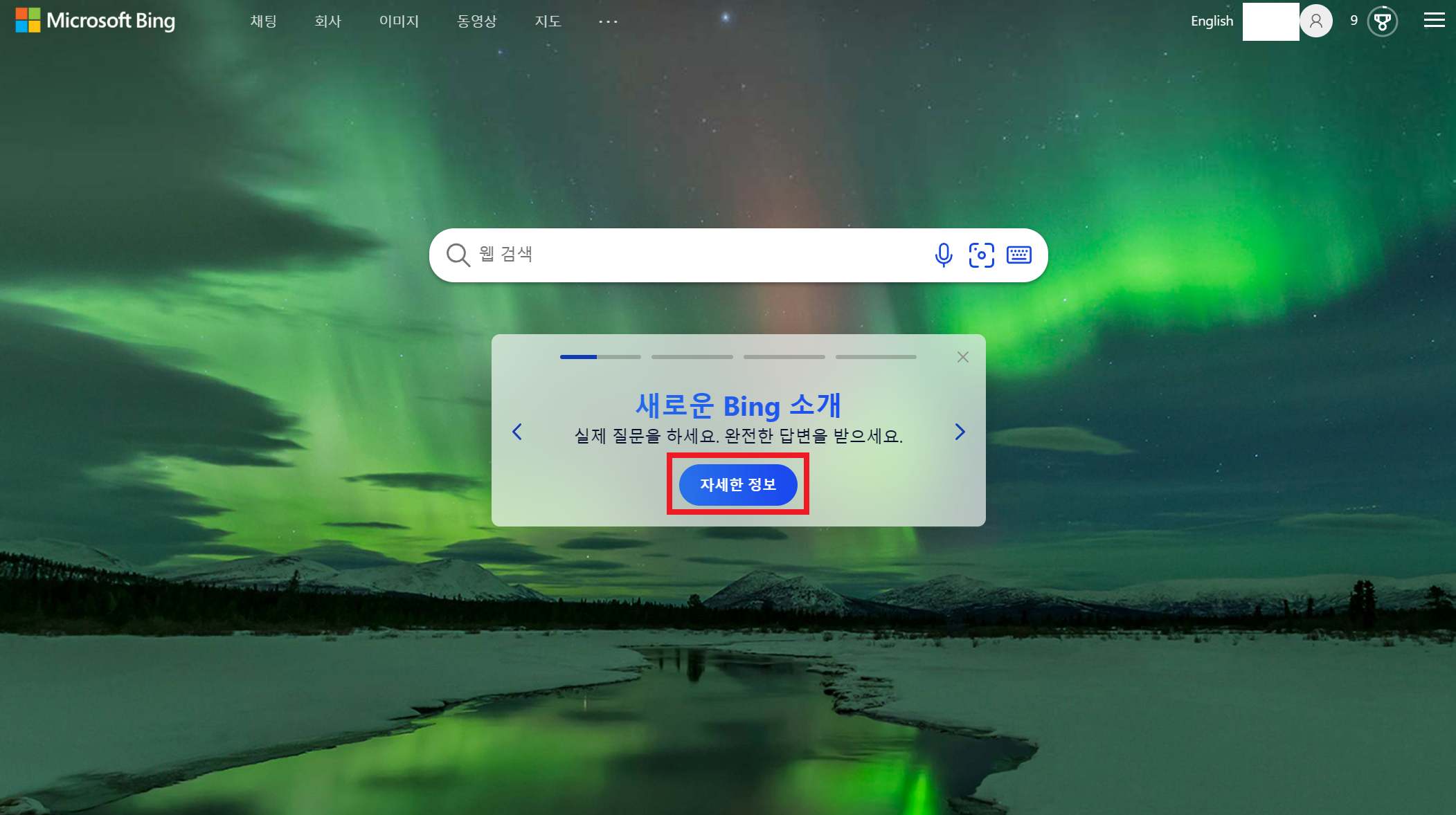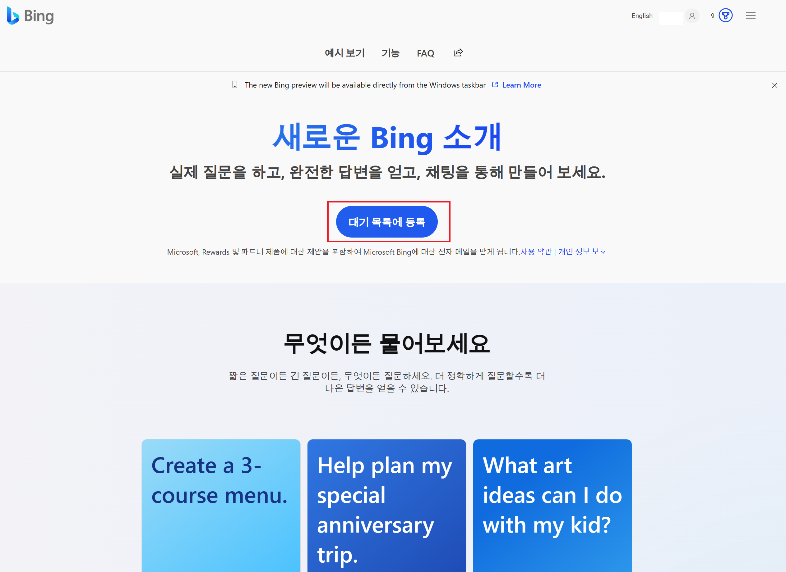 Edge 브라우저의 설치와 마이크로소프트 계정 로그인이 완료되면, '마이크로소프트 빙' 사이트에서 '자세한 정보'를 클릭한 다음, '대기목록에 등록'을 클릭한다.