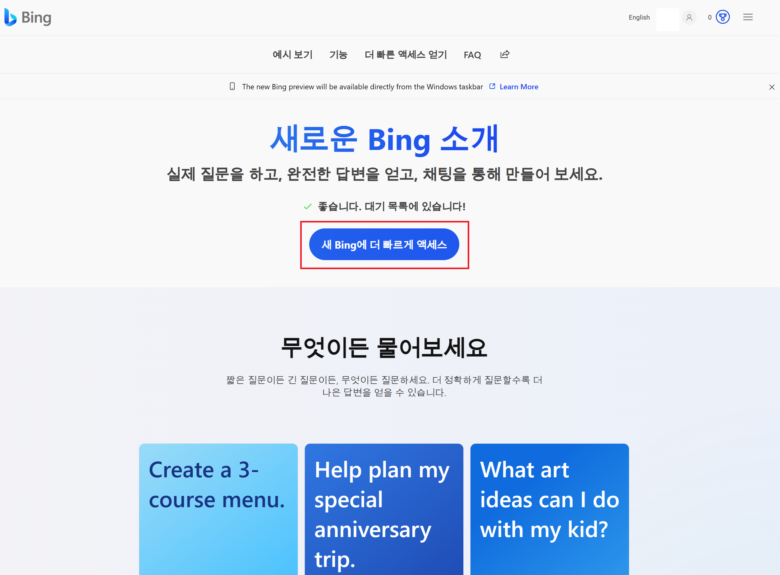 '대기 목록에 등록'을 클릭했으면 일단은 대기목록에 등록이 된 것이지만, 우리는 남들보다 조금이라도 더 빠르게 사용해보고 싶으므로 '새 Bing에 더 빠르게 액세스'를 클릭한 다음, 설치파일을 다운로드 받아서 실행시킨다.