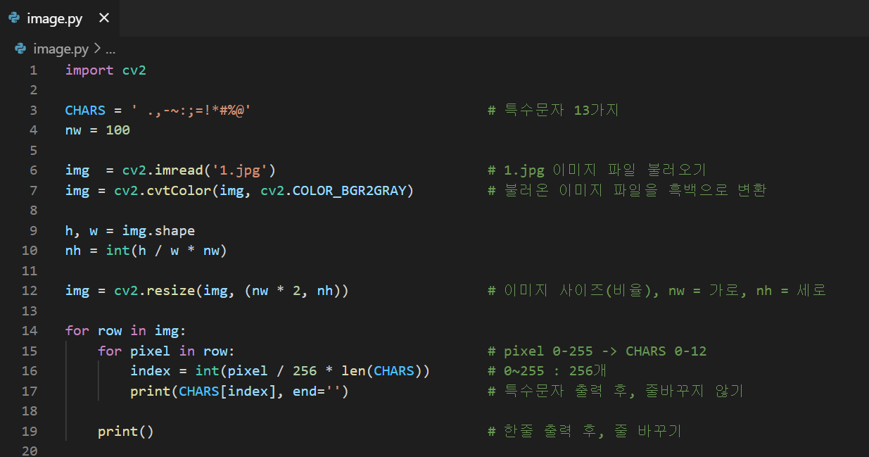 | import cv2 CHARS = ' .,-~:;=!*#%@' # 특수문자 13가지 nw = 100 img = cv2.imread('1.jpg') # 1.jpg 이미지 파일 불러오기 img = cv2.cvtColor(img, cv2.COLOR_BGR2GRAY) # 불러온 이미지 파일을 흑백으로 변환 h, w = img.shape nh = int(h / w * nw) img = cv2.resize(img, (nw * 2, nh)) # 이미지 사이즈(비율), nw = 가로, nh = 세로 for row in img: for pixel in row: # pixel 0-255 -> CHARS 0-12 index = int(pixel / 256 * len(CHARS)) # 0~255 : 256개 print(CHARS[index], end='') # 특수문자 출력 후, 줄바꾸지 않기 print() # 한줄 출력 후, 줄 바꾸기 |