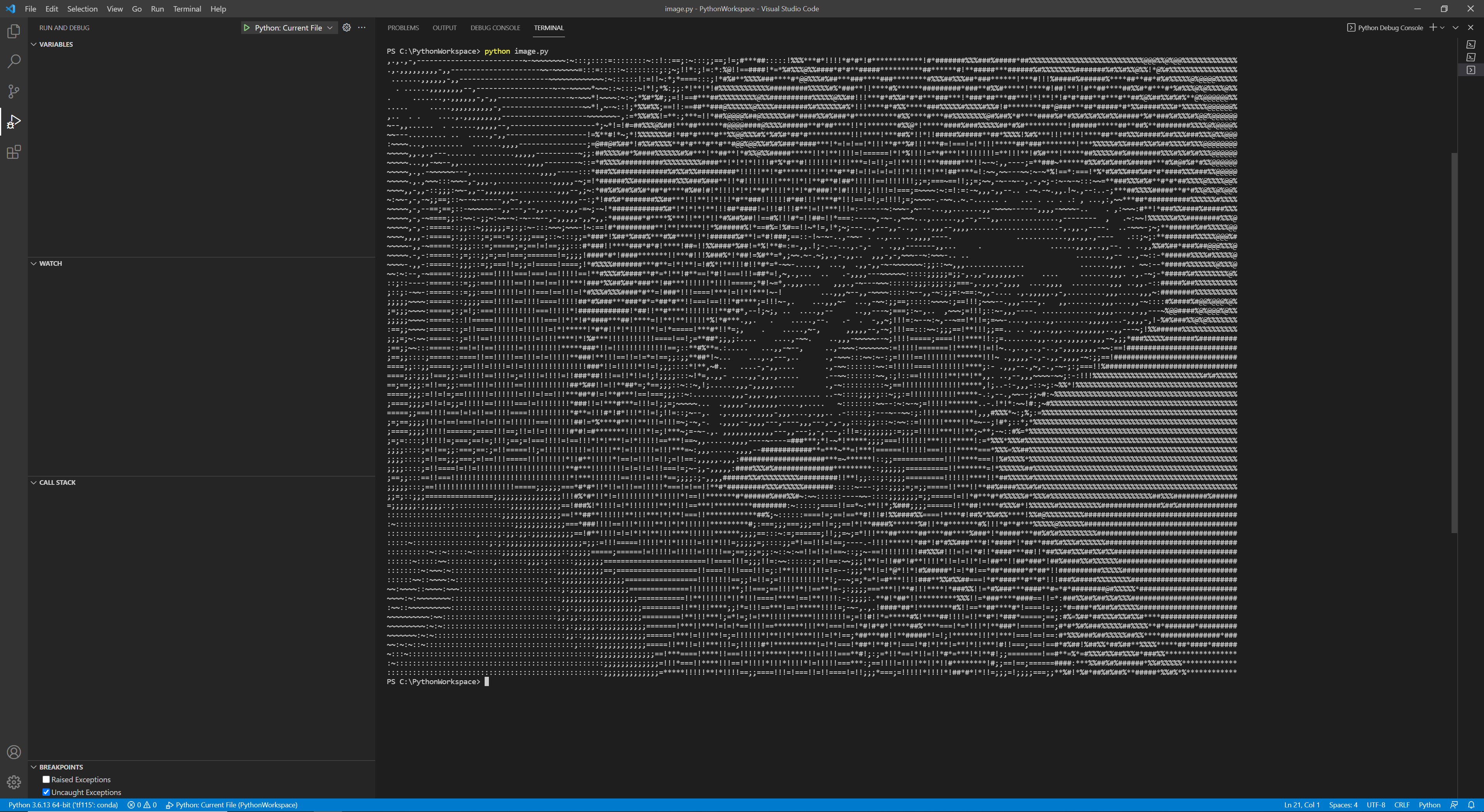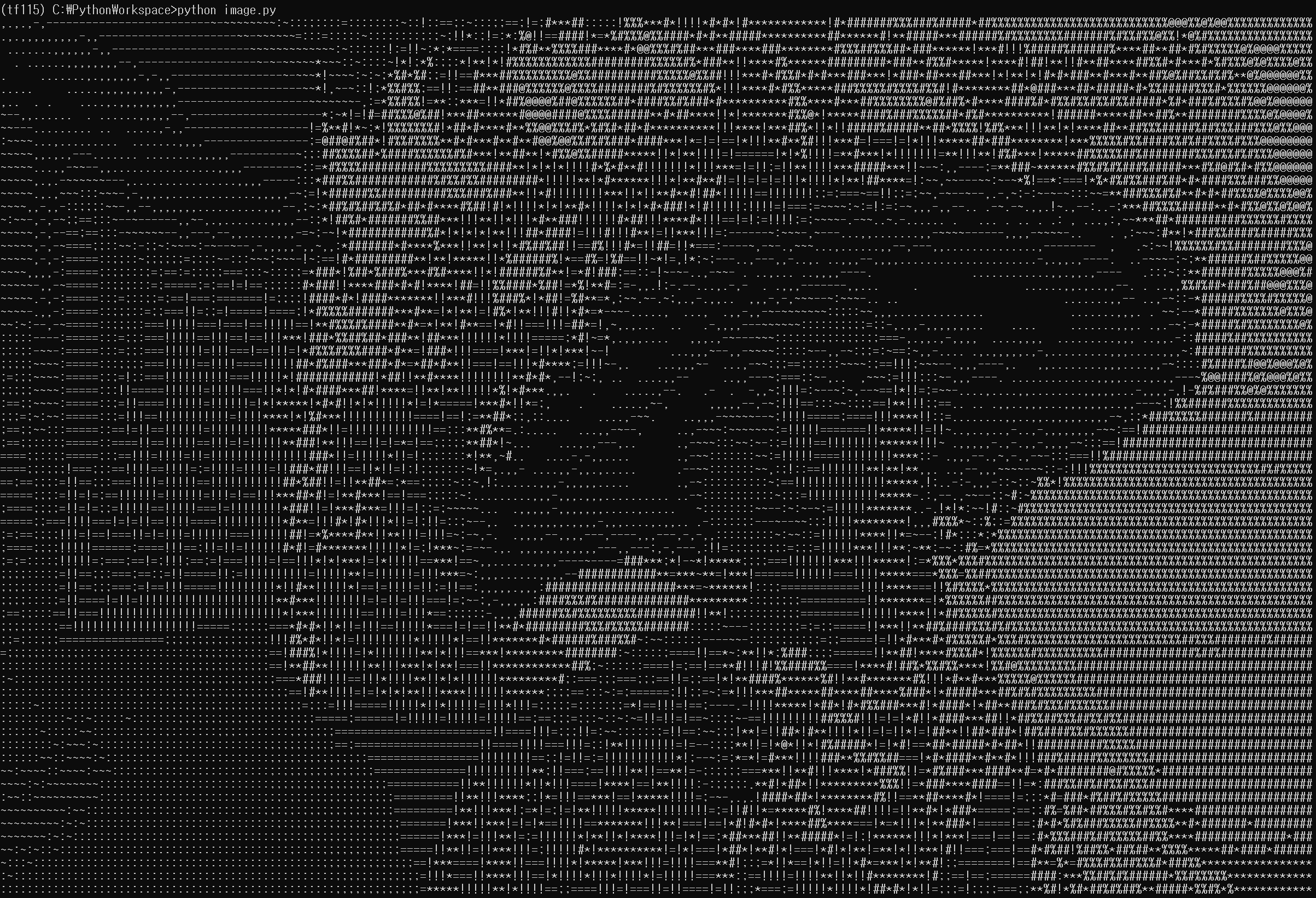실행이 완료되면, Terminal 창에 ' .,-~:;=!*#%@' 13개의 특수문자로 변환되서 출력된 것을 확인할 수 있다.