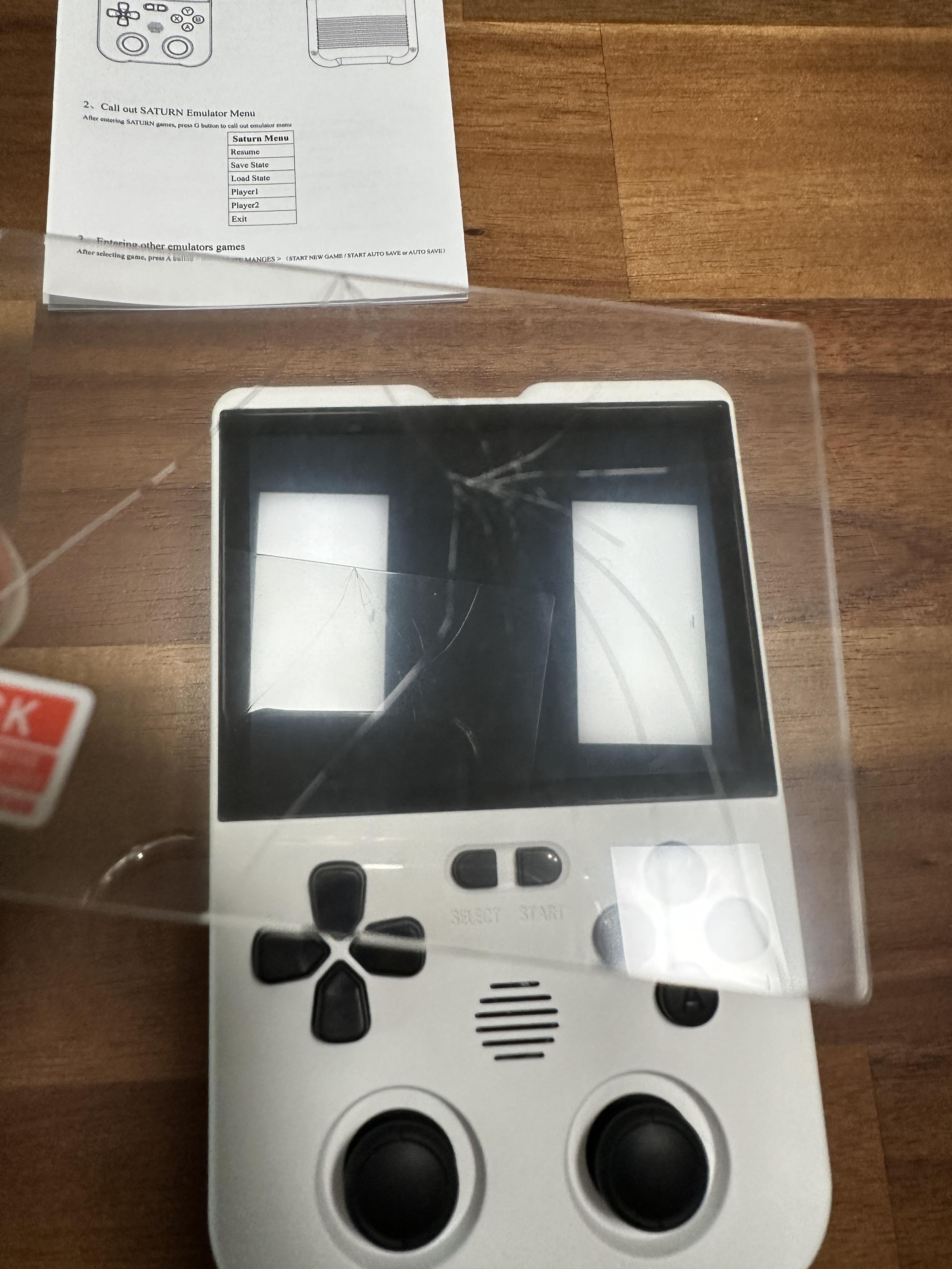 조이스틱 보호용 완충재랑 같이 포장이 되어있어서 감탄을 하며 내용물을 확인하는데 강화유리가 파손되어있었다. 다행히 본체는 파손된 부분 없이 잘 작동해서 강화유리는 별도로 구매했다.