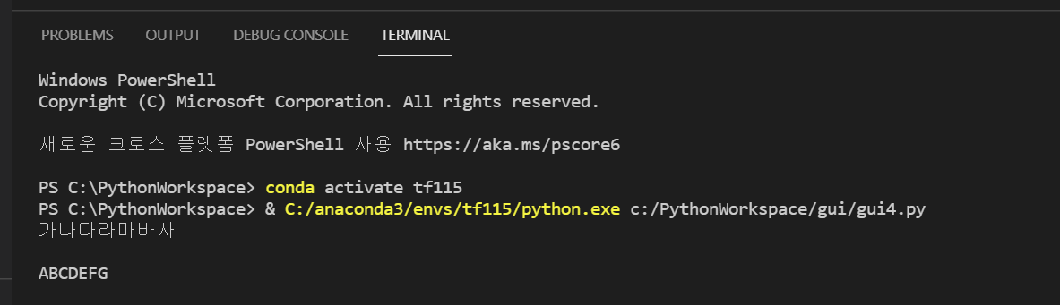 '글자를 입력하세요'라고 적혀있는 칸(Text)에 '가나다라마바사'를 입력하고, '한 줄만 입력하세요'라고 적혀있는 칸(Entry)에는 'ABCDEFG'를 입력한 후, 마우스로 '클릭'버튼을 클릭하면, gui4.py의 16~21번째 줄에 작성되어있는 명력이 실행되어 Terminal 창에는 '가나다라마바사', 'ABCDEFG'가 출력되고, 각각의 칸(Text, Entry)는 삭제가 된 것을 확인할 수 있다.