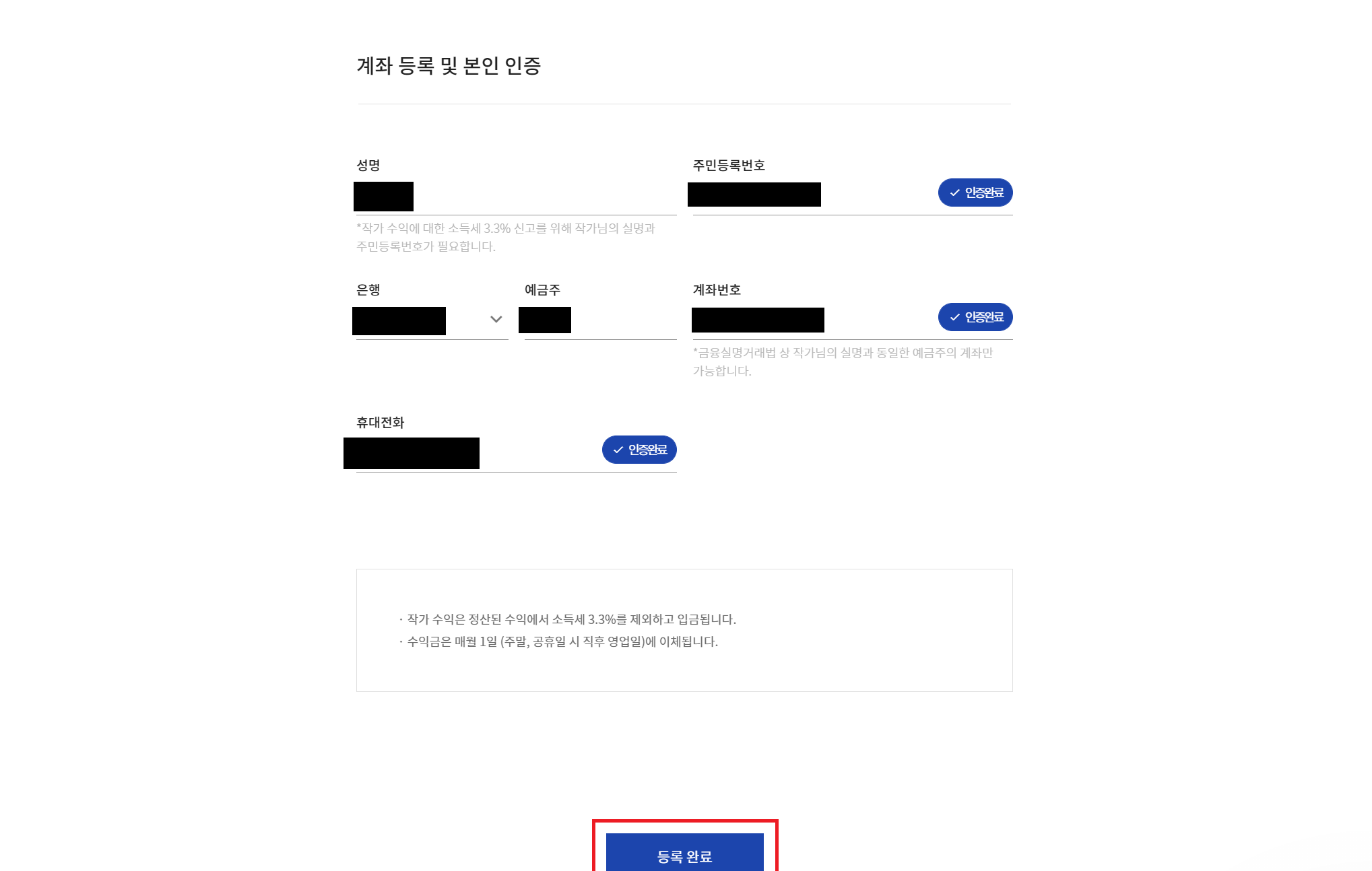 작가 등록 페이지에서 굿즈를 판매하기 위한 작가 등록 약관에 동의하고 주민등록번호, 휴대폰 번호, 은행계좌 등 본인인증을 진행한다.