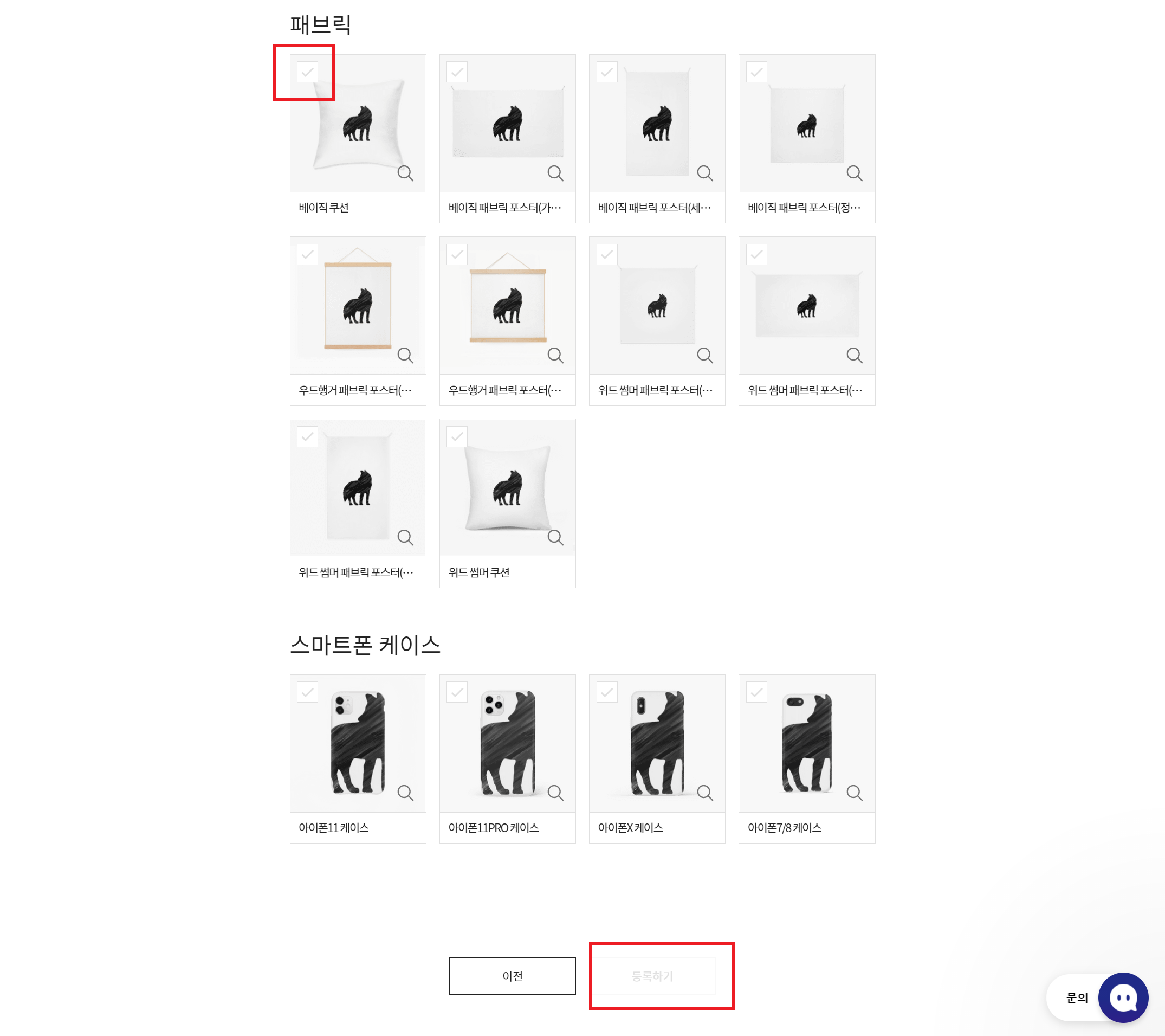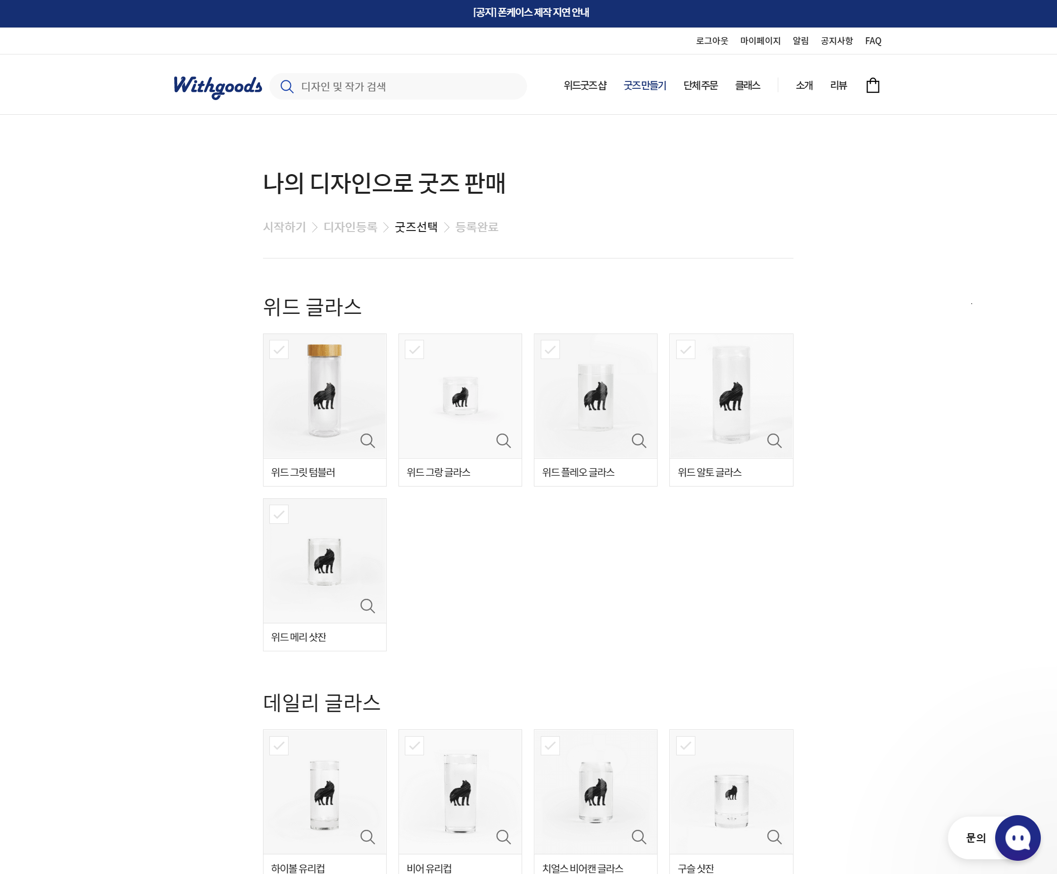 굿즈 선택 페이지에서는 위드굿즈에서 제작 가능한 모든 굿즈들이 표시된다. 여기에서 등록한 디자인으로 제작/판매를 원하는 굿즈를 선택할 수 있고, 등록한 디자인의 스케일이 안 맞는 경우, 각 굿즈 별로 등록한 디자인을 적당한 사이즈로 수정할 수 있다.