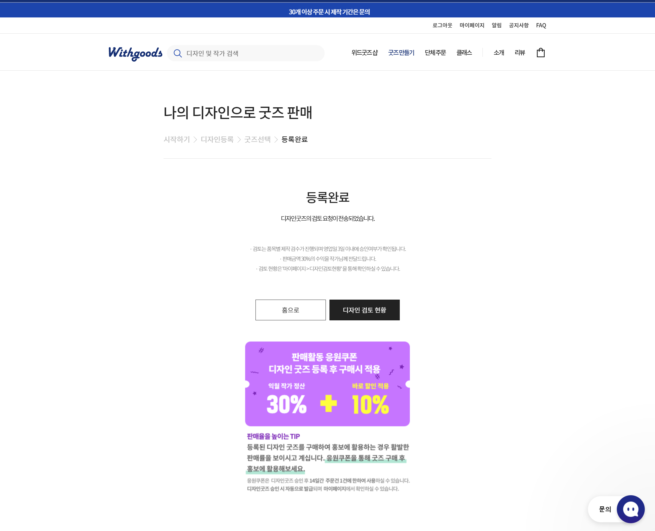 디자인 수정과 판매할 굿즈 선택이 완료되면, '등록하기'를 클릭해서 디자인 상품 등록을 완료하면, 아래와 같이 등록이 완료되었다는 메시지가 나오고, 검토가 완료되면 판매를 할 수 있게 된다.