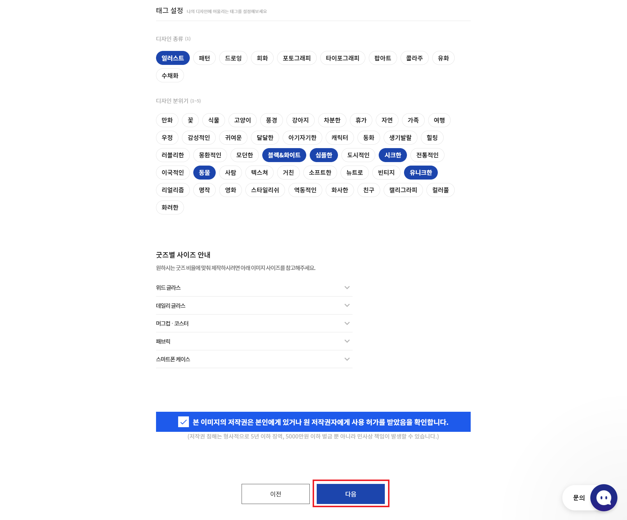 태그 선택을 완료하면, 저작권 관련 사항 확인/체크한 후, '다음'을 클릭하면 굿즈 선택 페이지로 이동한다.