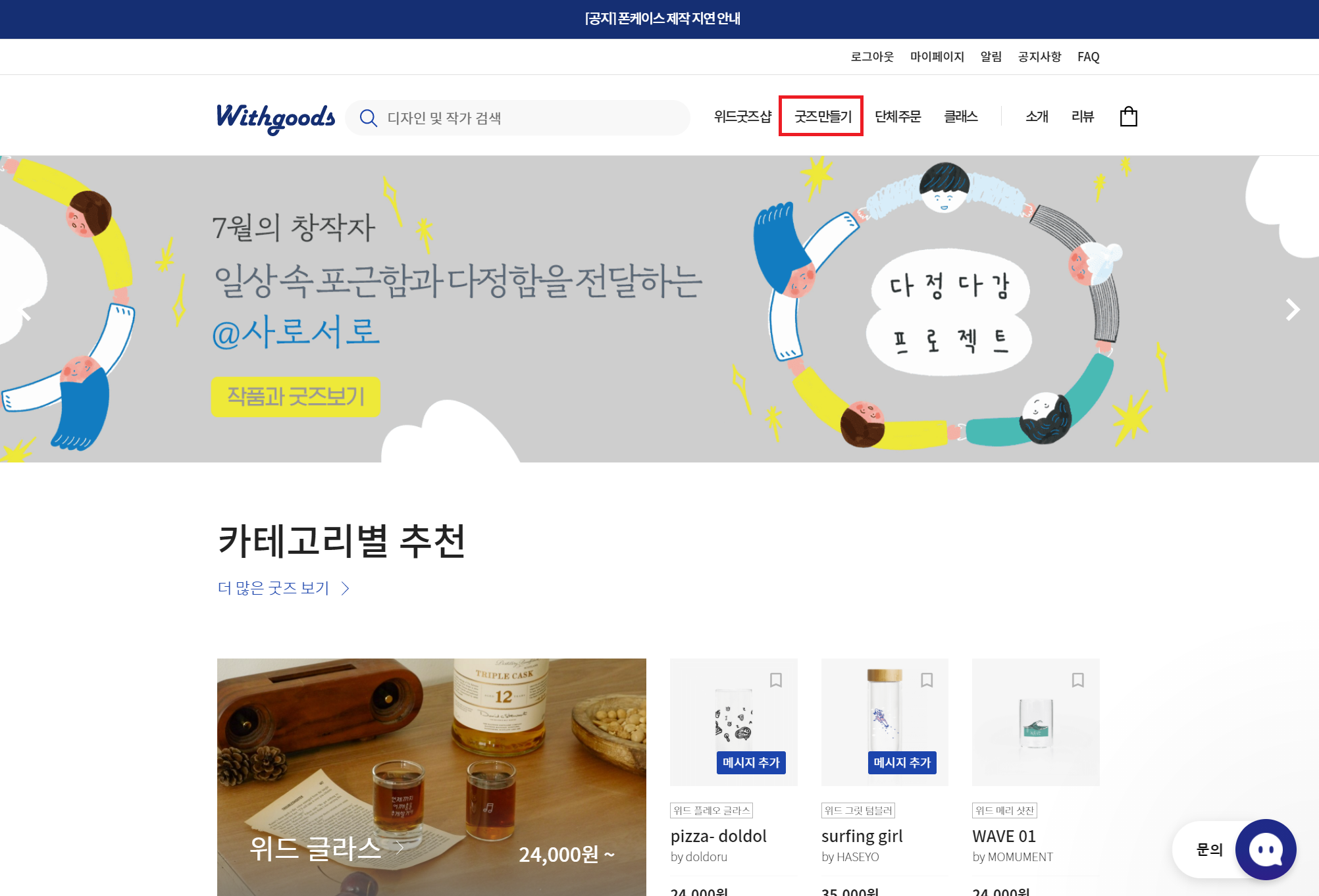 위드굿즈 회원가입이 완료되면 로그인 후, 상단 메뉴에서 '굿즈 만들기'를 클릭해서 굿즈 만들기 페이지로 이동한다.
