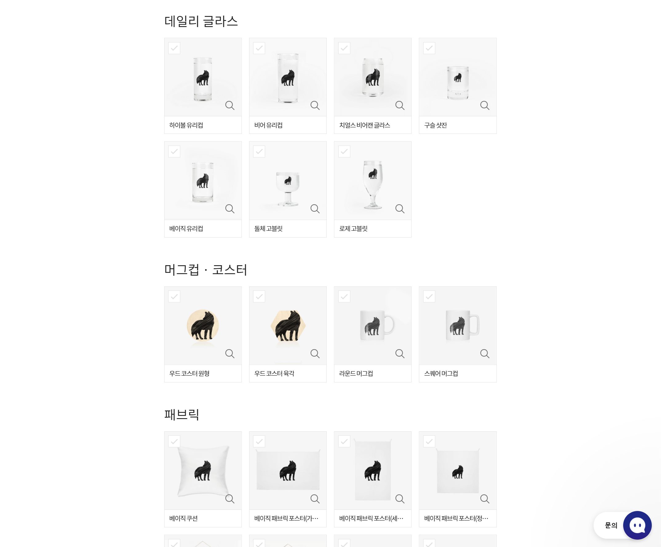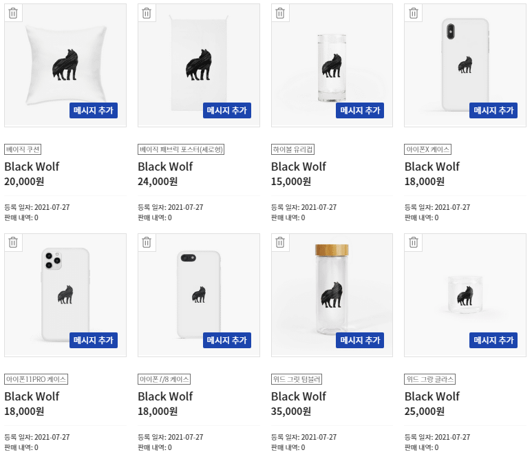굿즈 선택 페이지에서는 위드굿즈에서 제작 가능한 모든 굿즈들이 표시된다. 여기에서 등록한 디자인으로 제작/판매를 원하는 굿즈를 선택할 수 있고, 등록한 디자인의 스케일이 안 맞는 경우, 각 굿즈 별로 등록한 디자인을 적당한 사이즈로 수정할 수 있다.