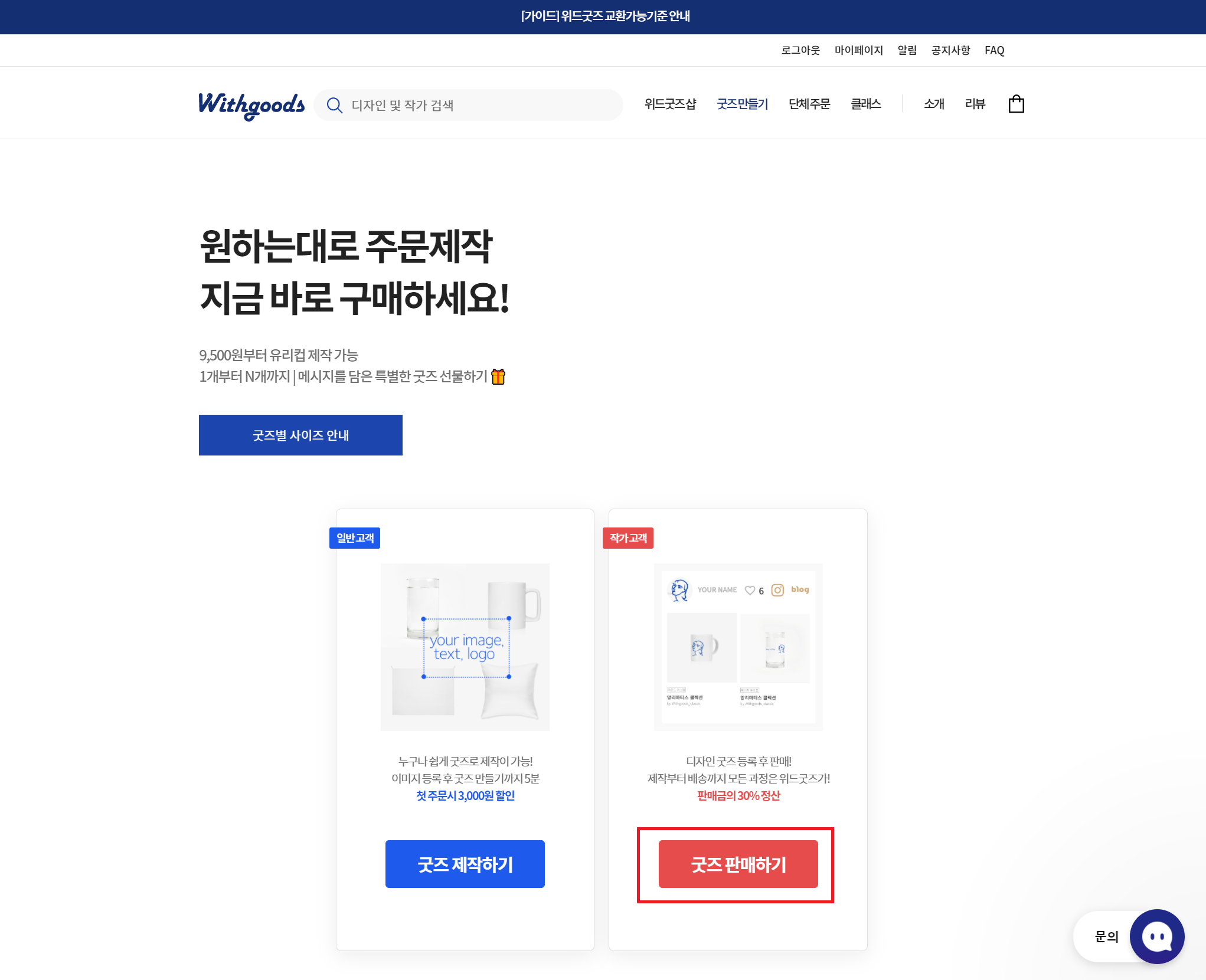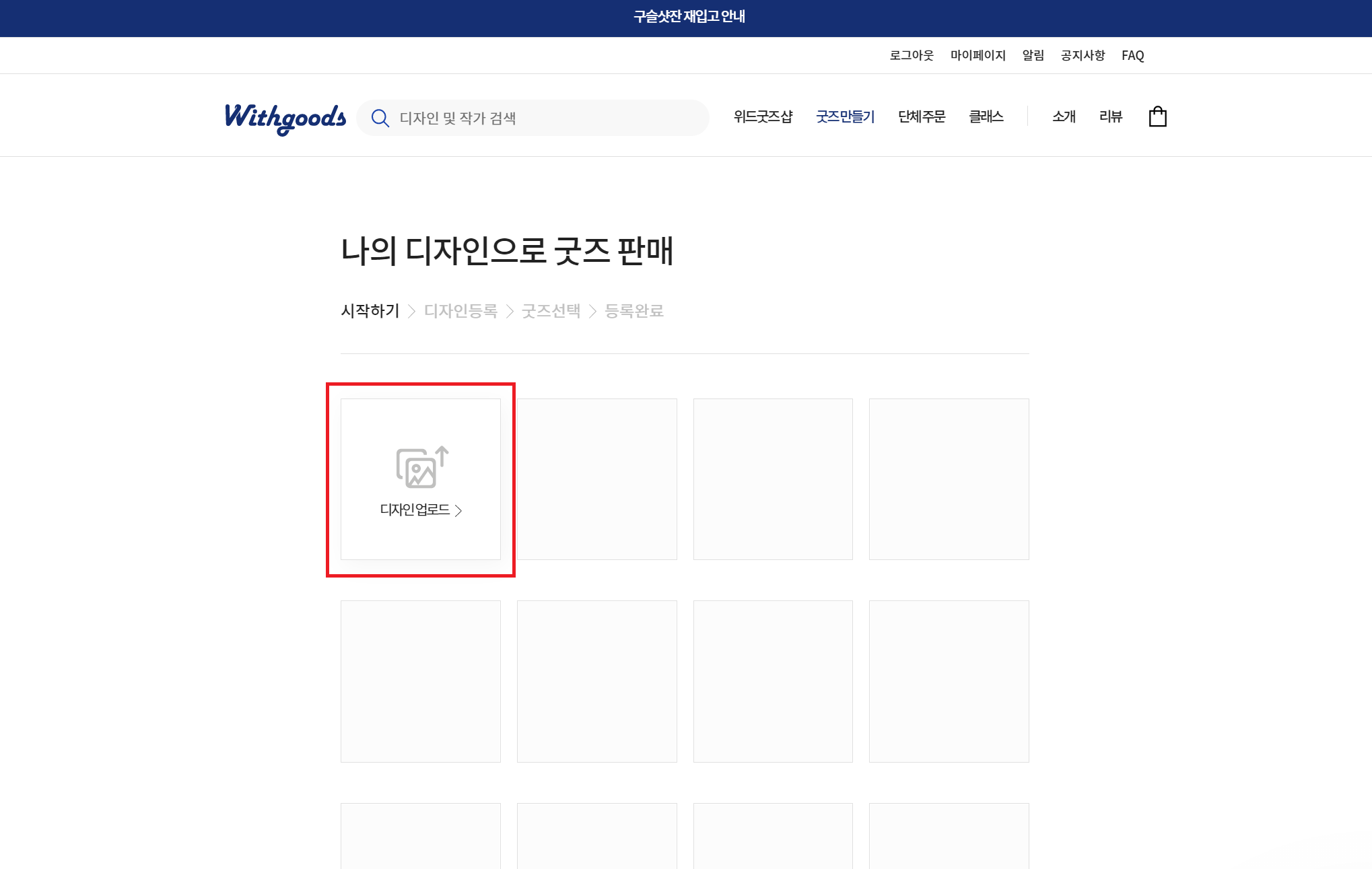 위드굿즈 회원가입이 완료되면 로그인 후, 상단 메뉴에서 '굿즈 만들기'를 클릭해서 굿즈 만들기 페이지로 이동한다.