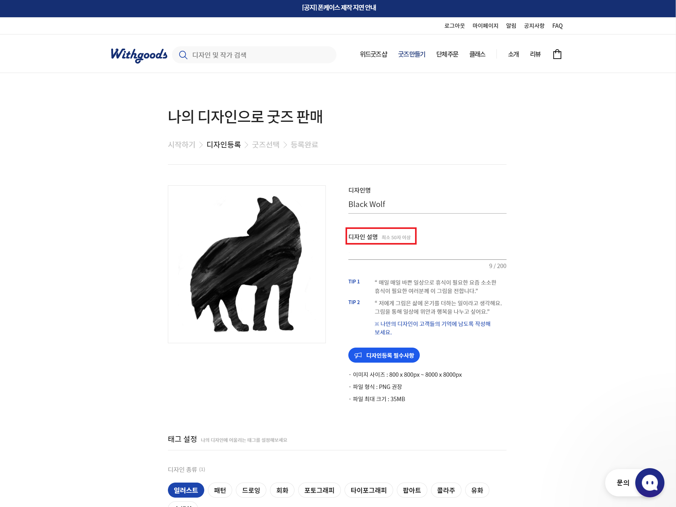준비한 이미지를 등록하고 디자인 명, 디자인 설명(50자 이상)을 입력하고, 디자인 종류와 분위기에 대한 적당한 태그를 선택한다.