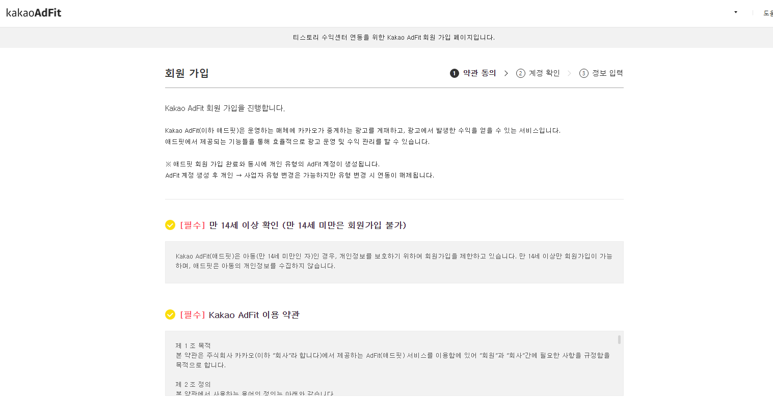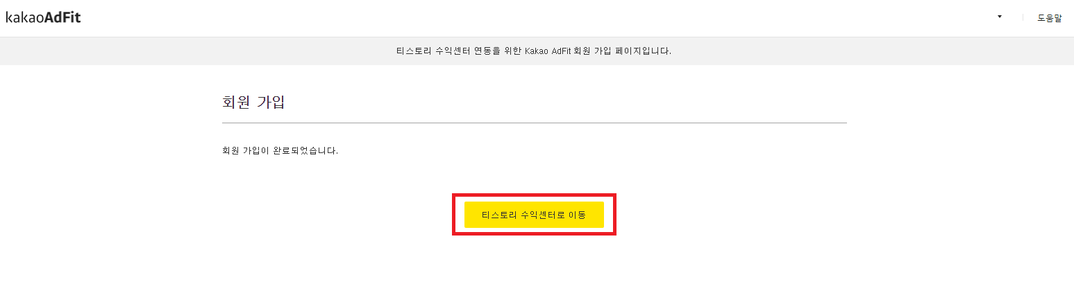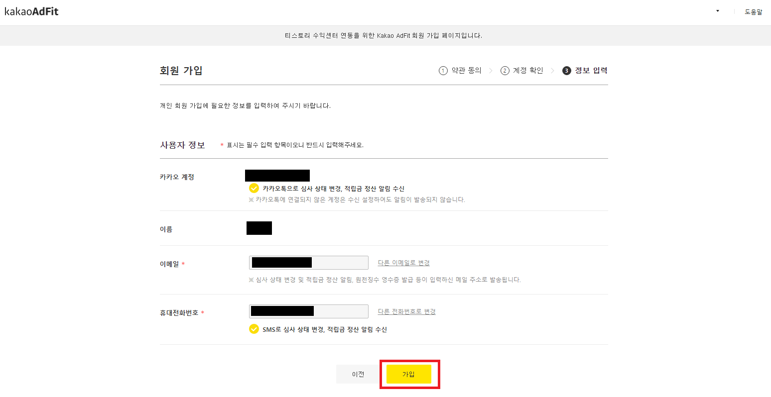 약관을 동의하고 나면 회원가입을 위한 카카오 계정 확인과 사용자 정보를 차례로 입력하고 '가입'을 클릭하면 가입이 완료되고 '티스토리 수익센터로 이동'을 클릭해서 다시 티스토리로 돌아온다.