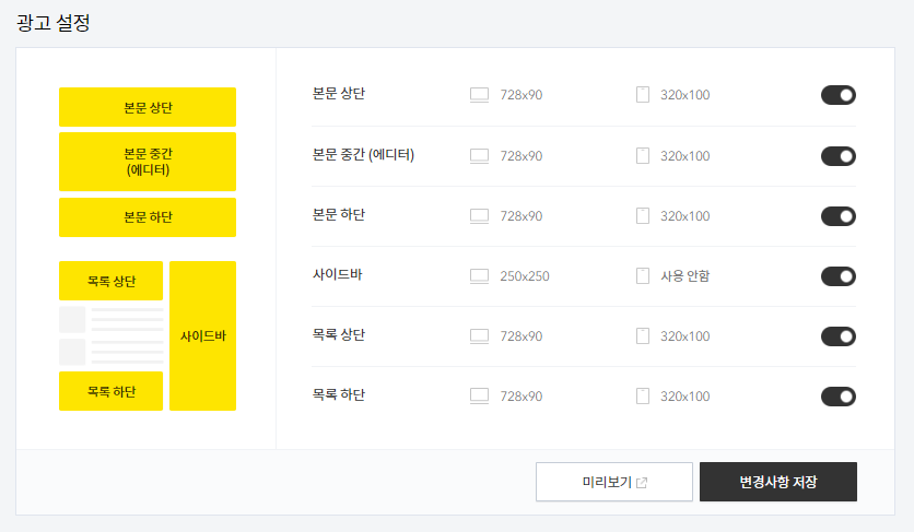 심사 완료되면 사용 중인 블로그 스킨에 맞게 적당한 위치에 광고 설정을 해주면 된다.