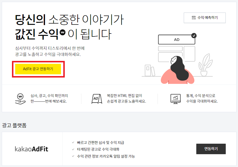 애드핏과 연동하려면 이 'AdFit 연동하기'를 클릭한다.
