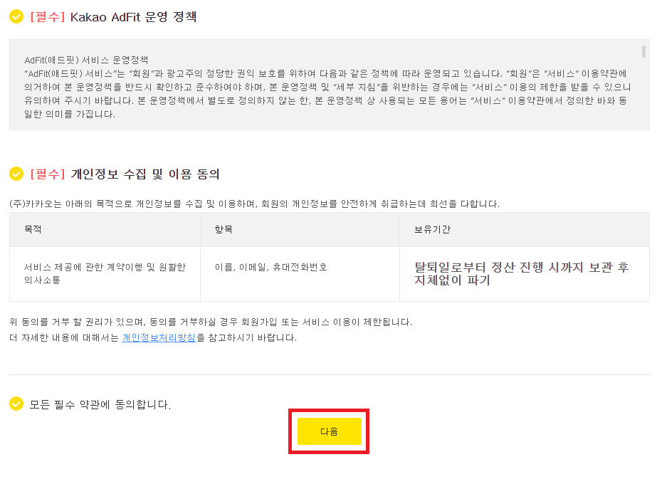약관 동의 페이지에서 관련 약관을 확인하고 '다음'을 클릭한다.