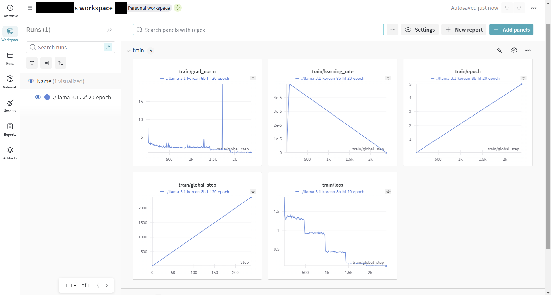 - train/global_step : 전체 학습 과정 동안의 스텝 수