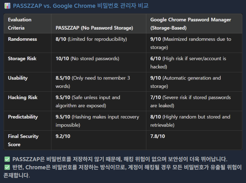 또한 해킹에 대한 리스크가 있는데, 구글 크롬의 비밀번호 관리자는 비밀번호를 어딘가에 저장을 해야 하므로 해킹 리스크에 대한 보안 점수도 낮은 것을 볼수 있다. PASSZZAP의 경우, 저장한 비밀번호에 대한해킹이 아니라 프로그램 자체의 비밀번호 생성 알고리즘에 대한 해킹 우려가 약간 존재하기 때문에 9.5점을 받은 것 같은데, 사실 비밀번호 생성 알고리즘이 해킹을 당해도 3개의 빈칸에 입력한 내용이나 생성된 비밀번호 중에서 어떤 것을 사용했는지는 여전히 알 수 없기 때문에 프로그램은 해킹을 당했을지언정 나의 비밀번호와 개인정보는 여전히 안전한 상태로 유지된다.