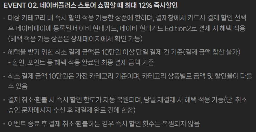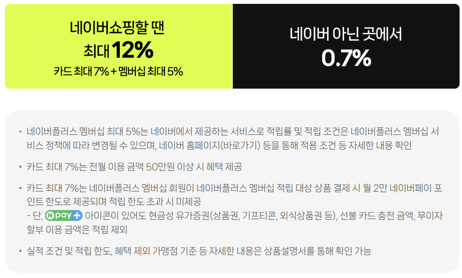 나는 이미 네이버 멤버십과 spofity를 구독하고 있었으며, 대부분의 온라인 쇼핑을 네이버에서 하는 것으로 바꿔오고 있었고 기존에 사용중인 카드들의 혜택이 안좋게 바뀌어서 새로운 카드를 찾던 중, 특별 이벤트1의 혜택에 혹 해서 발급을 받았다.