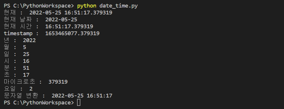 코드 작성이 완료되면, 'Run' 탭에서 'Run and Debug'를 클릭하거나, Powershell에서 'python date_time.py'를 입력해서 작성된 'date_time.py'의 코드를 실행시키면, 날짜와 시간이 각 단위별로 구분되어서 출력되는 것을 확인할 수 있다.