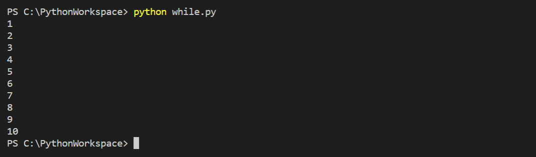 while 반복문 뒤에 'True'가 아닌 조건(a <= 10)이 있을 경우에는 무한히 반복하는 것이 아니라 a값이 1부터 10일때 까지 반복하고 a값이 11이 되면 while문 하위에 포함된 내용을 반복(실행)하지 않고 프로그램이 종료되는 것을 알 수 있다.