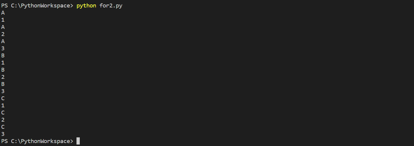 코드 작성이 완료되면, 'Run' 탭에서 'Run and Debug'를 클릭하거나, Powershell에서 'python for2.py'를 입력해서 작성된 'for2.py'의 코드를 실행시키면, 리스트 'aa'의 요소인 'A', 'B', 'C'와 'bb'의 요소인 '1', '2', '3'가 for문의 종속관계에 따라 순서대로 출력되는 것을 확인할 수 있다.