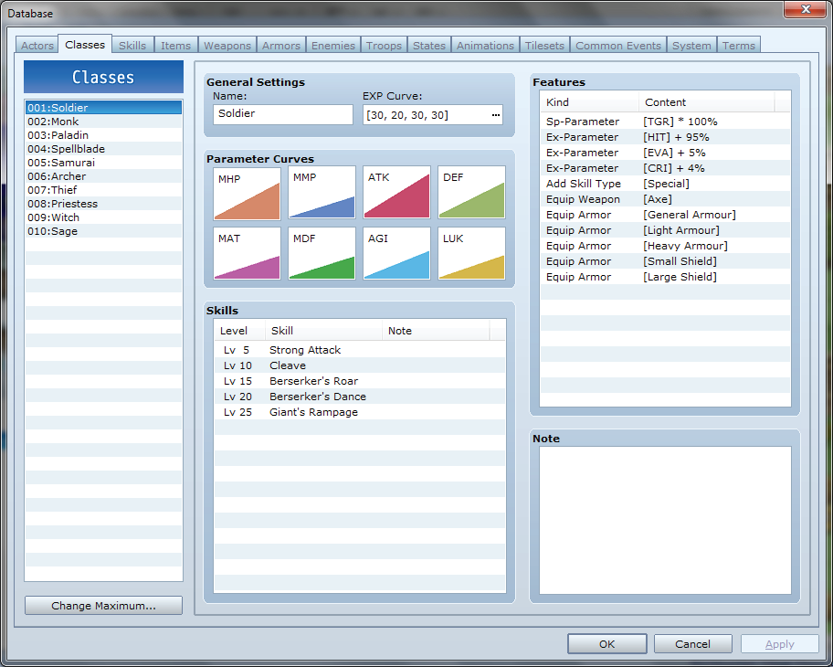 Classes : 이 탭은 플레이 가능한 캐릭터가 사용하는 클래스를 생성하기 위한 것입니다. 클래스는 캐릭터의 능력치 성장과 레벨을 올리면서 배우는 기술을 결정합니다.