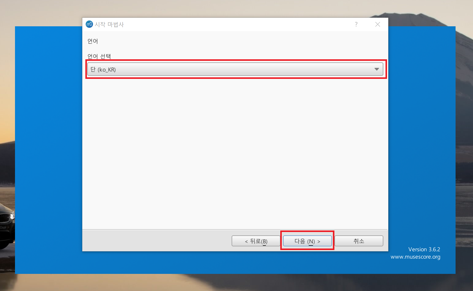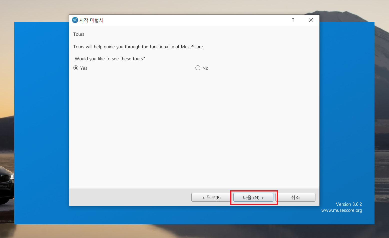 프로그램이 실행되면 시작 마법사 창이 뜨는데 '다음'을 클릭해서 초기 설정을 진행한다.