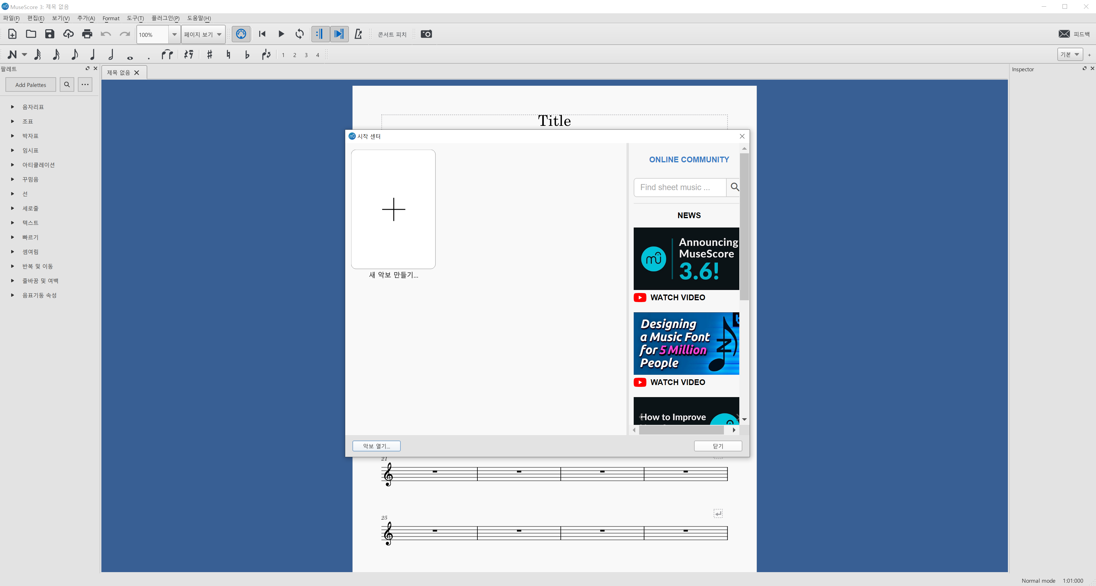 이 핸드북은 MuseScore 버젼 2.0 이후의 버전에 적용 됩니다. 또한 이 핸드북은 뮤즈스코어 커뮤니티에 의해 보완, 유지 됩니다. 당신도 도움을 주실 수 있습니다. 시작하기 이 장에서는 처음에 뮤즈