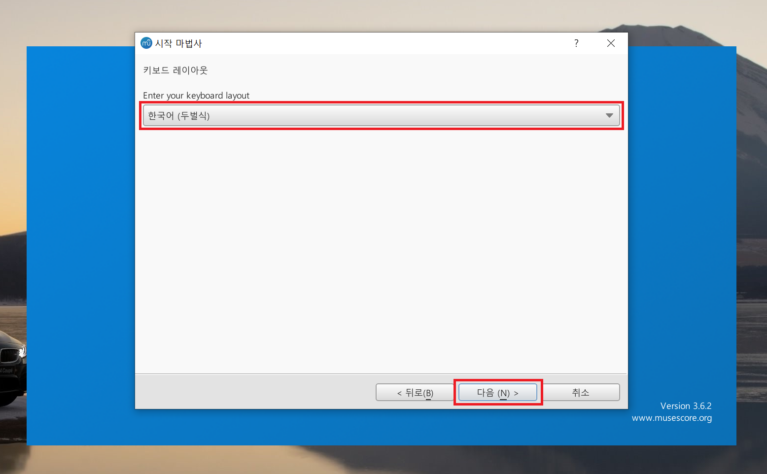 프로그램이 실행되면 시작 마법사 창이 뜨는데 '다음'을 클릭해서 초기 설정을 진행한다.
