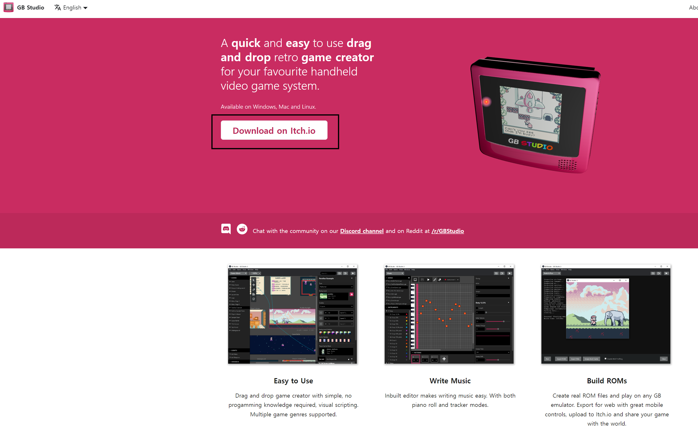 검색사이트에서 'GB Studio'를 검색해서 'GB Studio'를 클릭하여 공식 홈페이지로 이동 후, 'Download on Itch.io' 항목을 선택하면 다운로드 페이지로 이동한다.