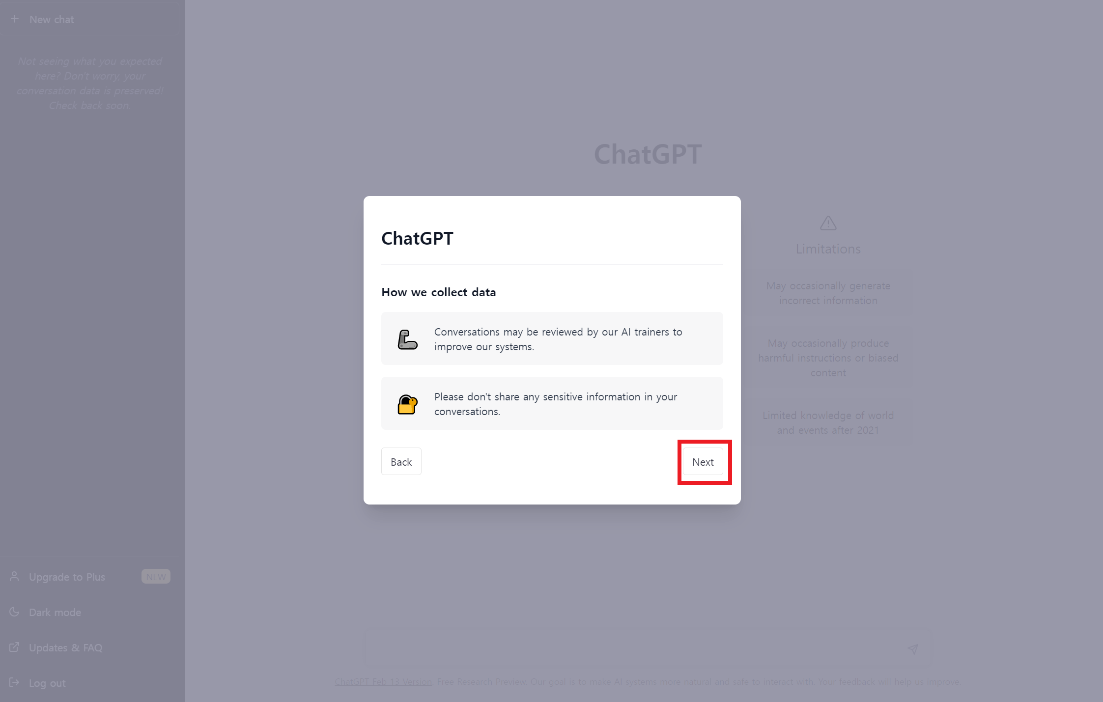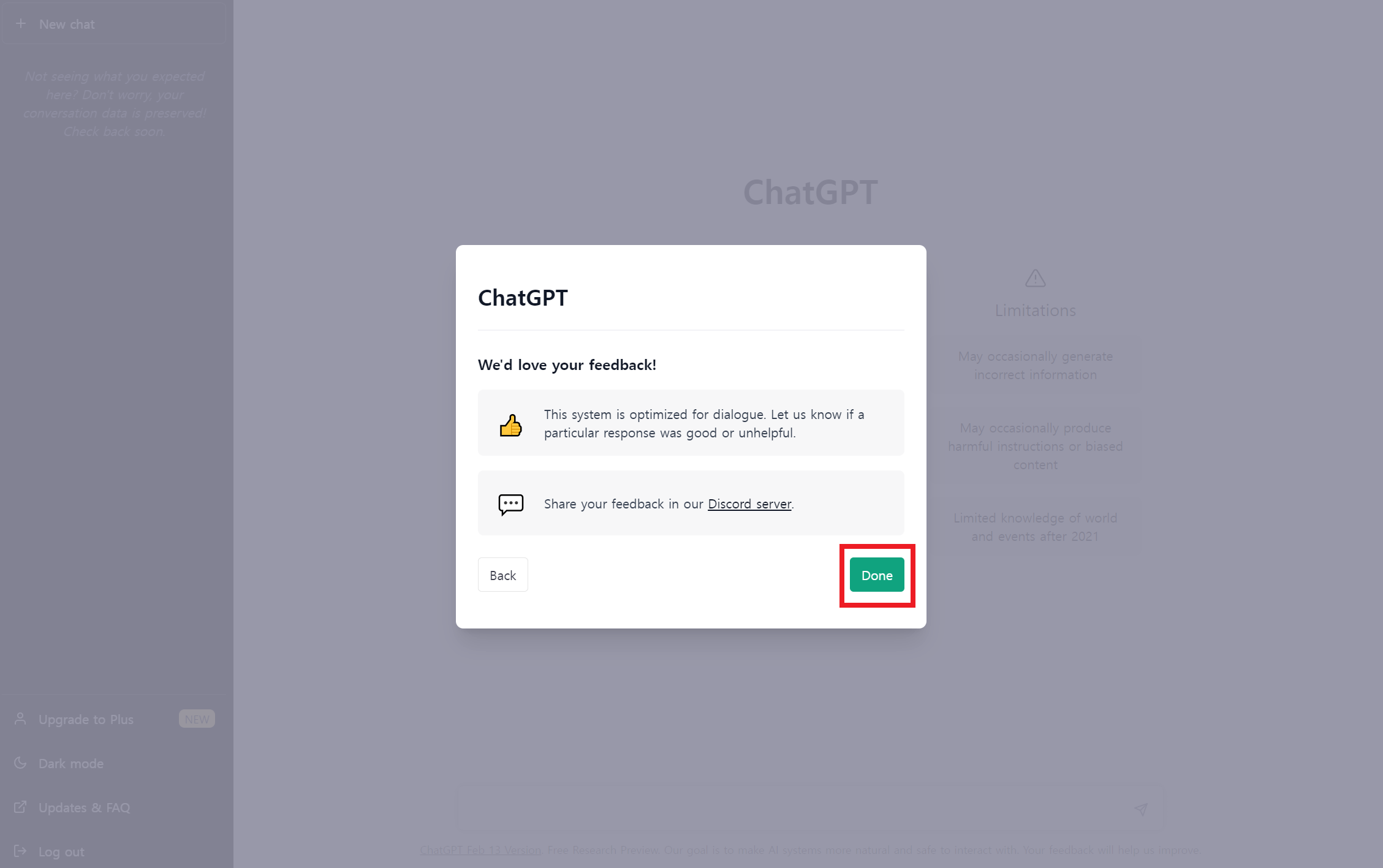 안내사항은 구글 번역기나 크롬 브라우저의 번역 기능을 이용해서 확인하고 'Next'나 'Done'을 눌러서 넘어가면 ChatGPT에게 물어볼 수 있는 몇 가지 예시, 제한사항 등과 함께 입력창이 나타난다.