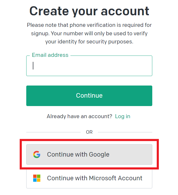 Sign up 클릭해서 ChatGPT 계정을 생성하는데, 직접 이메일을 입력하는 방법과 구글 계정으로 가입을 하는 방법이 있다. 여기에서는 'Countinue with Goole'를 클릭해서 구글 이메일로 가입을 진행한다.