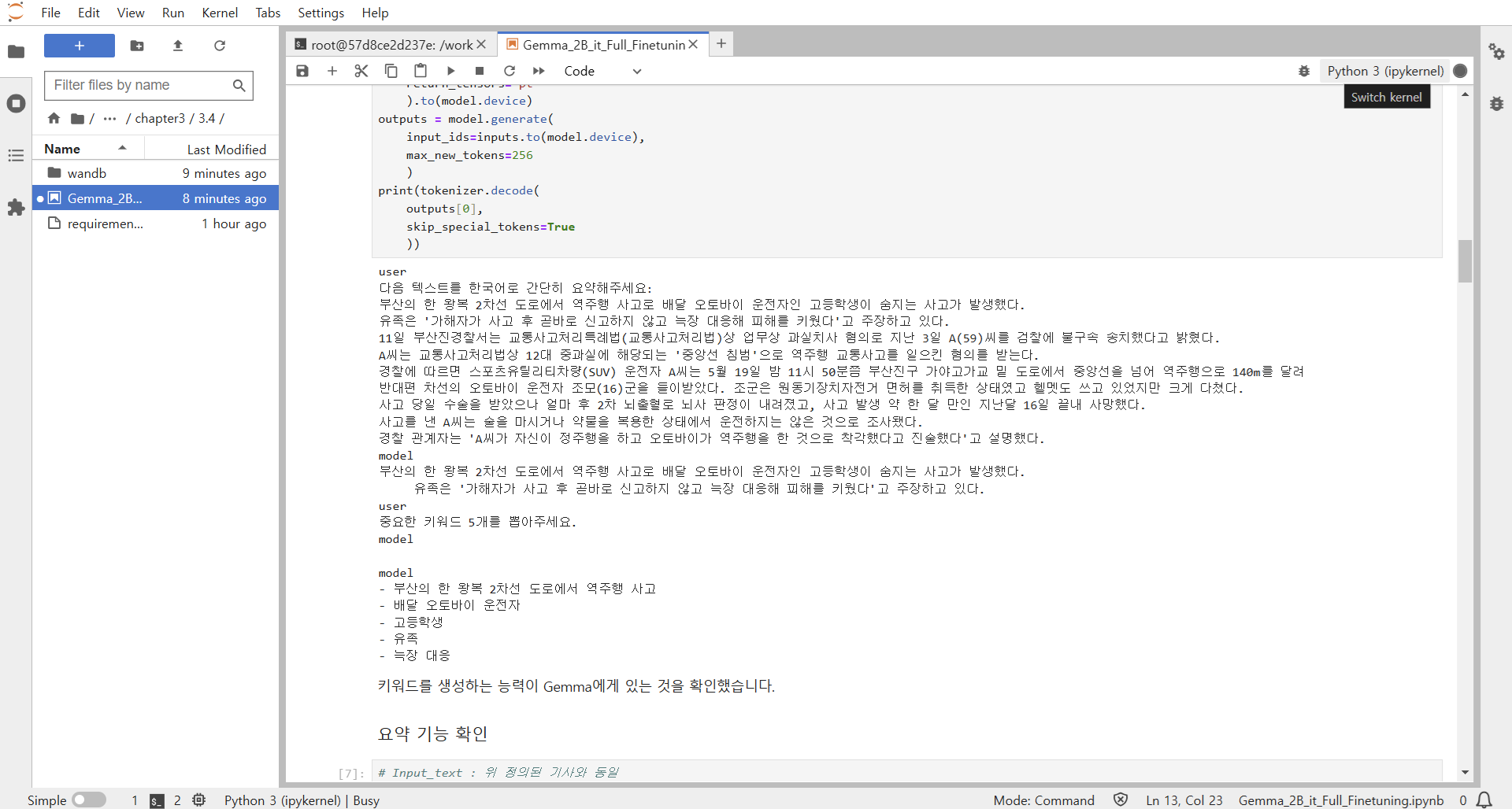 3.4.8 학습 파라미터 설정output_dir : 학습 중 만들어지는 체크포인트 저장 폴더 지정max_steps : 모델이 학습하는 총 스텝 수per_device_train_batch_size : 학습할 때 각 GPU나 CPU에서 한번에 처리할 데이터 샘플의 수per_device_eval_batch_size : 평가할 때 각 GPU나 CPU에서 한번에 처리할 데이터 샘플의 수weight_decay : 과적합을 막기 위해 모델 가중치를 조절하는 강도logging_dir : 로깅 도구가 사용할, 학습 중 발생하는 로그 정보를 저장하는 위치 지정logging_steps : 학습 상태, 손실값 등을 기록하는 주기 → 학습 과정 추적할 수 있음report_to : 학습 현황 관찰할 도구 (ex. wandb.ai..