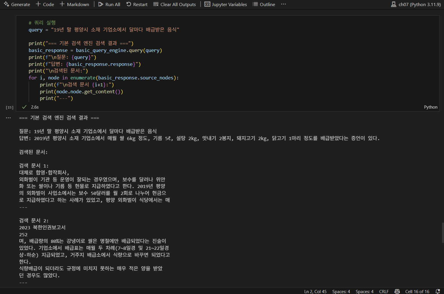 4.1 개발 환경 구축하기​4.2 실습용 데이터 준비​4.3 PDF 파일 다루기4.3.2 텍스트 분할텍스트 분할 = 청킹 = 긴 문장을 짧게 나누어 노드에 담는 작업하나의 모큐먼트 안에 여러 의미가 뒤섞여 있을 수 있으므로, 의미의 일관성을 유지하며 인덱싱을 하려면 텍스트를 별도로 분할하는 절차가 필요함잘 분할된 데이터는 RAG의 답변 성능에 큰 영향을 미치며, 답변 정확도 뿐 아니라 답변 속도에도 영향을 준다.​4.3.3 인덱싱데이터를 구조화하여 빠르게 검색할 수 있도록 하는 과정라마인덱스에서는 문서를 노드로 분할한 뒤, 각 노드의 의미를 벡터 임베딩으로 변환해서 저장인덱스가 잘 구축되어 있으면 데이터를 효율적으로 건색하고 관리할 수 있음​​4.4 텍스트 파일 다루기​4.5 CSV 파일 다루기​4.6 ..