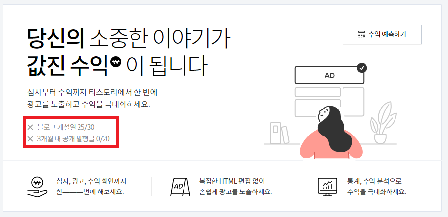 티스토리 블로그 관리 페이지에서 수익 페이지로 가면 애드핏 연동 조건을 만족하는지 확인할 수 있고, 조건을 만족한다면, 'AdFit 광고 연동하기'로 표시되는 것을 확인할 수 있다. 애드핏과 연동하려면 이 'AdFit 연동하기'를 클릭한다. 'AdFit 광고 연동하기'를 클릭한 다음, 아래의 광고 플랫폼 항목에서 '카카오 로그인'을 클릭하면 약관 동의 페이지로 이동한다. 약관 동의 페이지에서 관련 약관을 확인하고 '다음'을 클릭한다. 약관을 동의하고 나면 회원가입을 위한 카카오 계정 확인과 사용자 정보를 차례로 입력하고 '가입'을 클릭하면 가입이 완료되고 '티스토리 수익센터로 이동'을 클릭해서 다시 티스토리로 돌아온다. 티스토리의 수익 페이지로 돌아오면 광고 플랫폼 항목에 '심사 중'이라고 표시되는 것을..