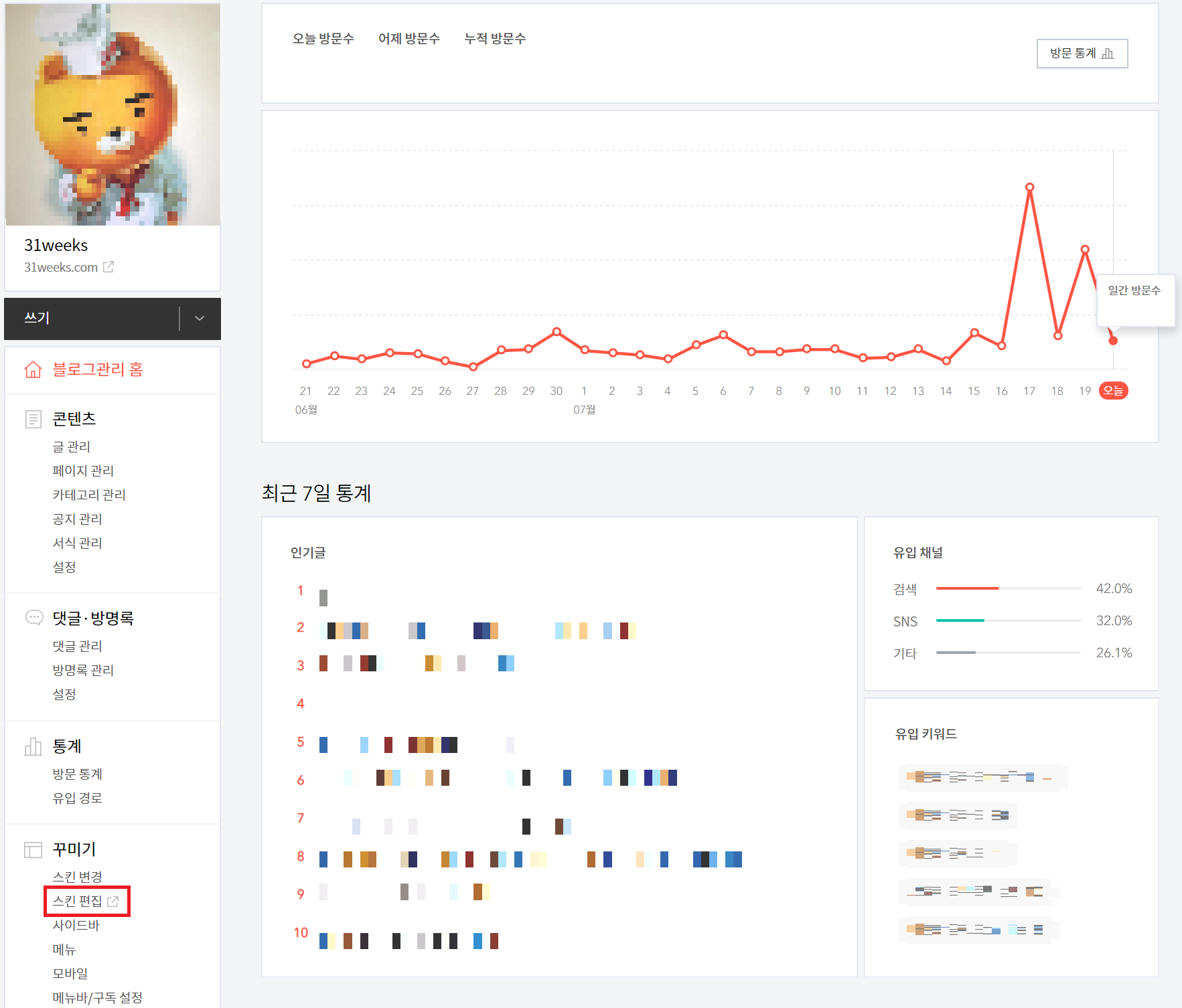 그런 다음, 자신의 티스토리 블로그의 '블로그관리 홈' 페이지로 이동하여 좌측 메뉴 중, '스킨 편집'을 클릭한다.