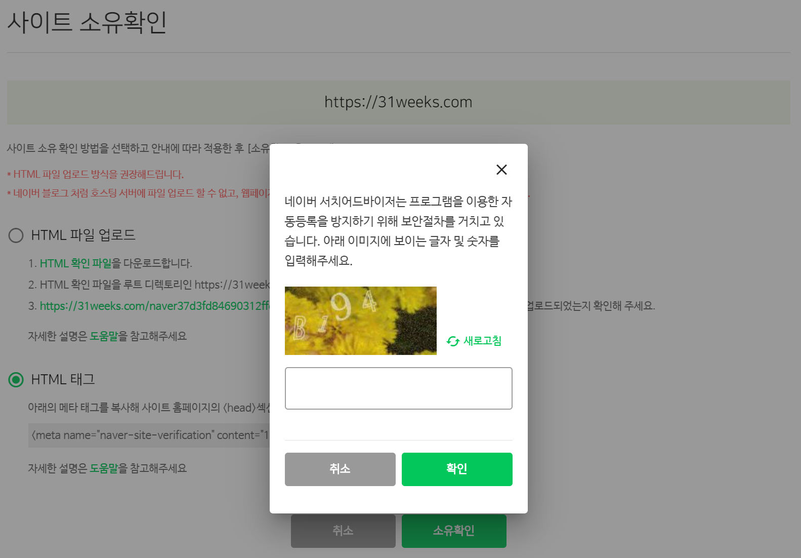 네이버 서치어드바이저 태그와 주석을 추가한 후, 우측 상단에 '적용'을 클릭해서 변경사항을 적용하고 다시 네이버 서치어드바이저 창으로 돌아가서 '소유확인'을 클릭하면, 프로그램을 이용한 자동 등록을 방지하기 위해 캡차 인증을 하고 사이트 등록을 완료할 수 있다.