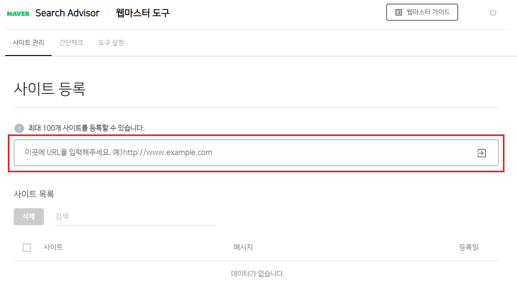 사이트 등록이 완료되면 '웹마스터 도구 - 사이트 관리'에서 등록된 사이트와 등록일을 확인할 수 있다.