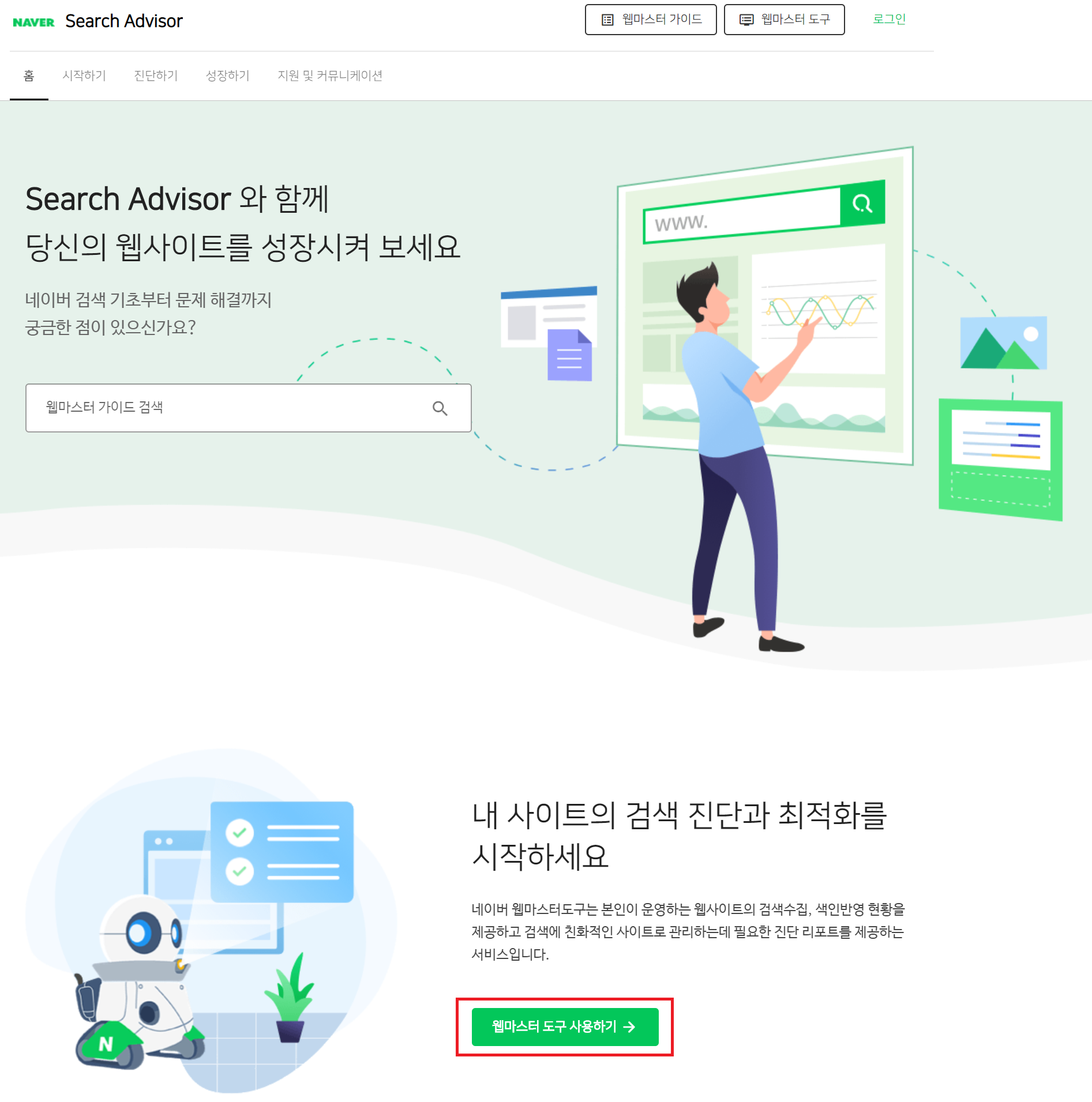 우선, 네이버 서치어드바이저 홈 화면에서 로그인한 후, 아래쪽에 '웹마스터 도구 사용하기'를 클릭한다.