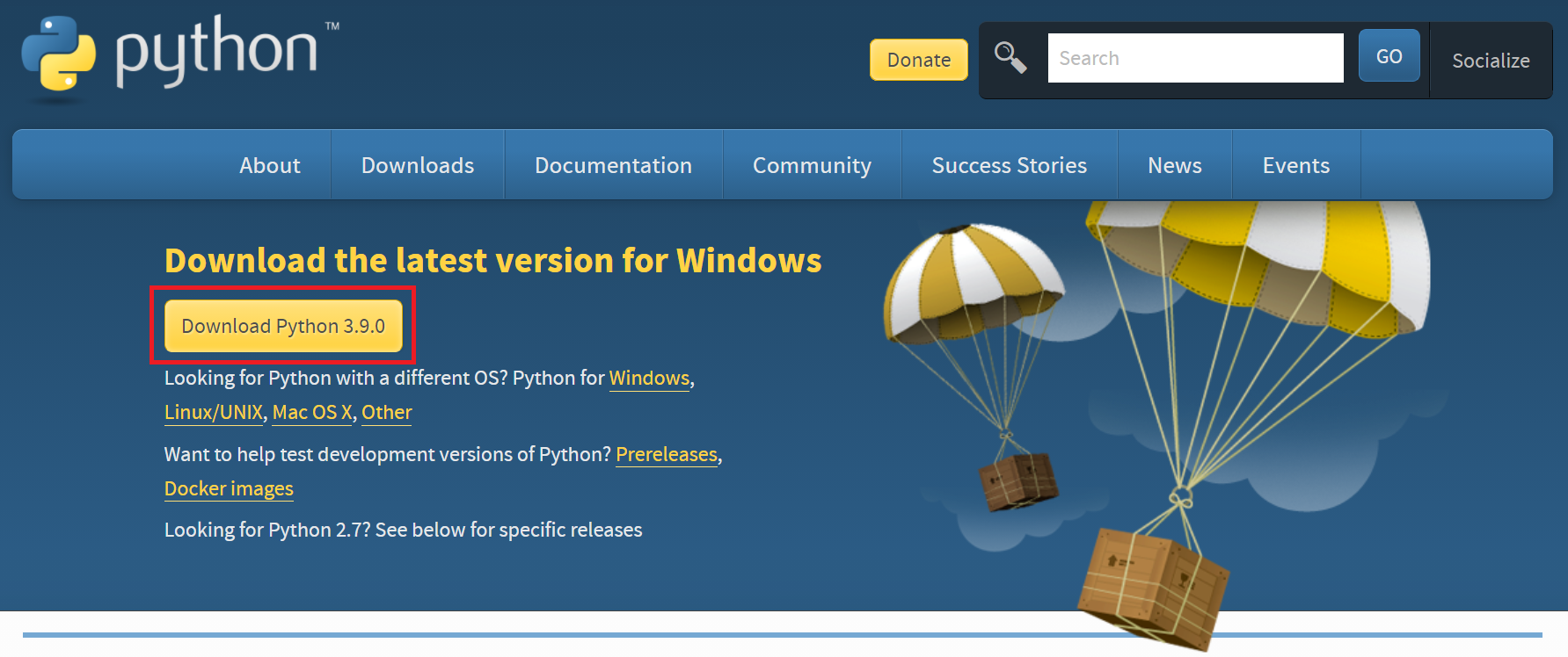 다운로드 페이지로 전환되면 'Download Python 3.9.0'를 클릭하면 파이썬 3.9.0 (64-bit) 버전이 다운로드된다.